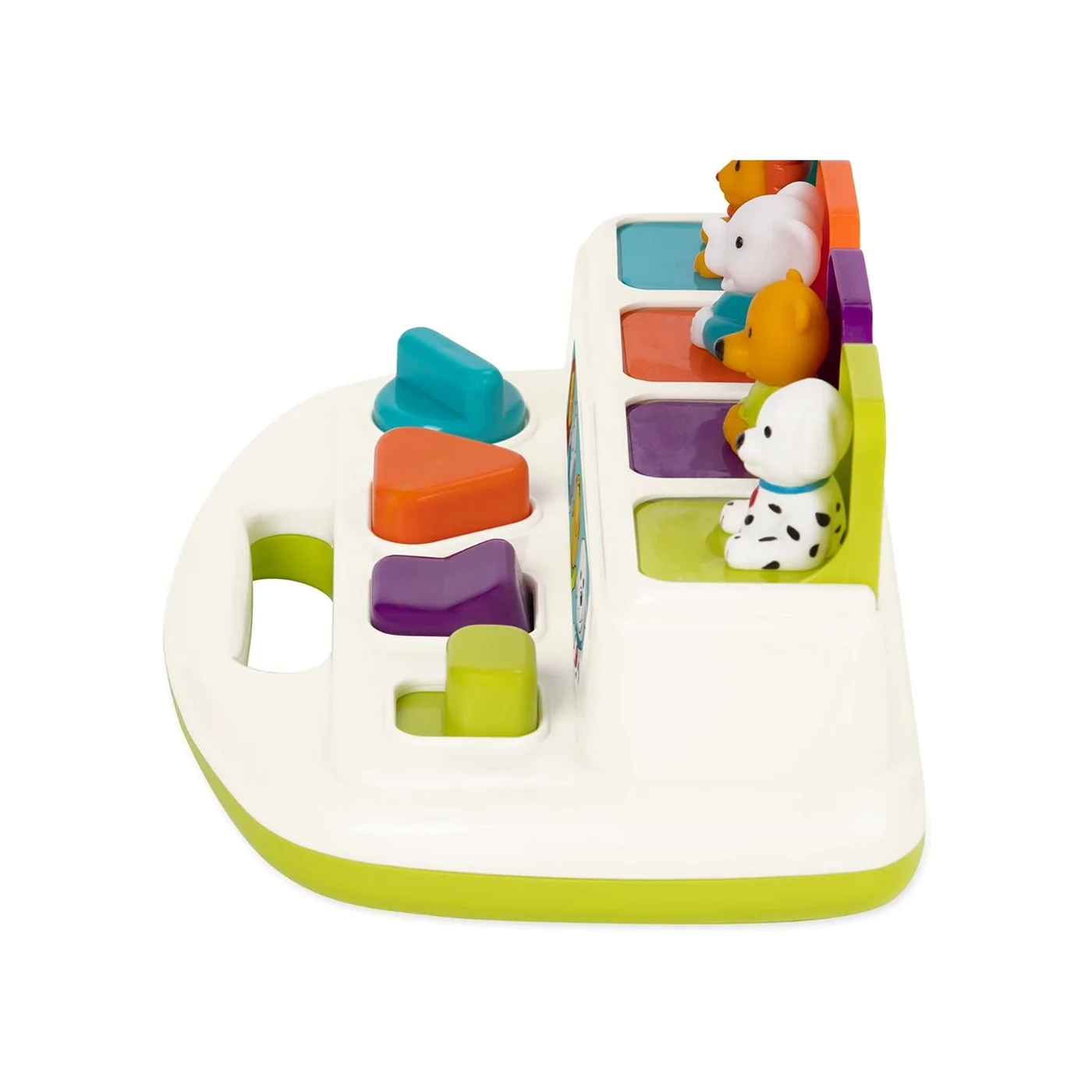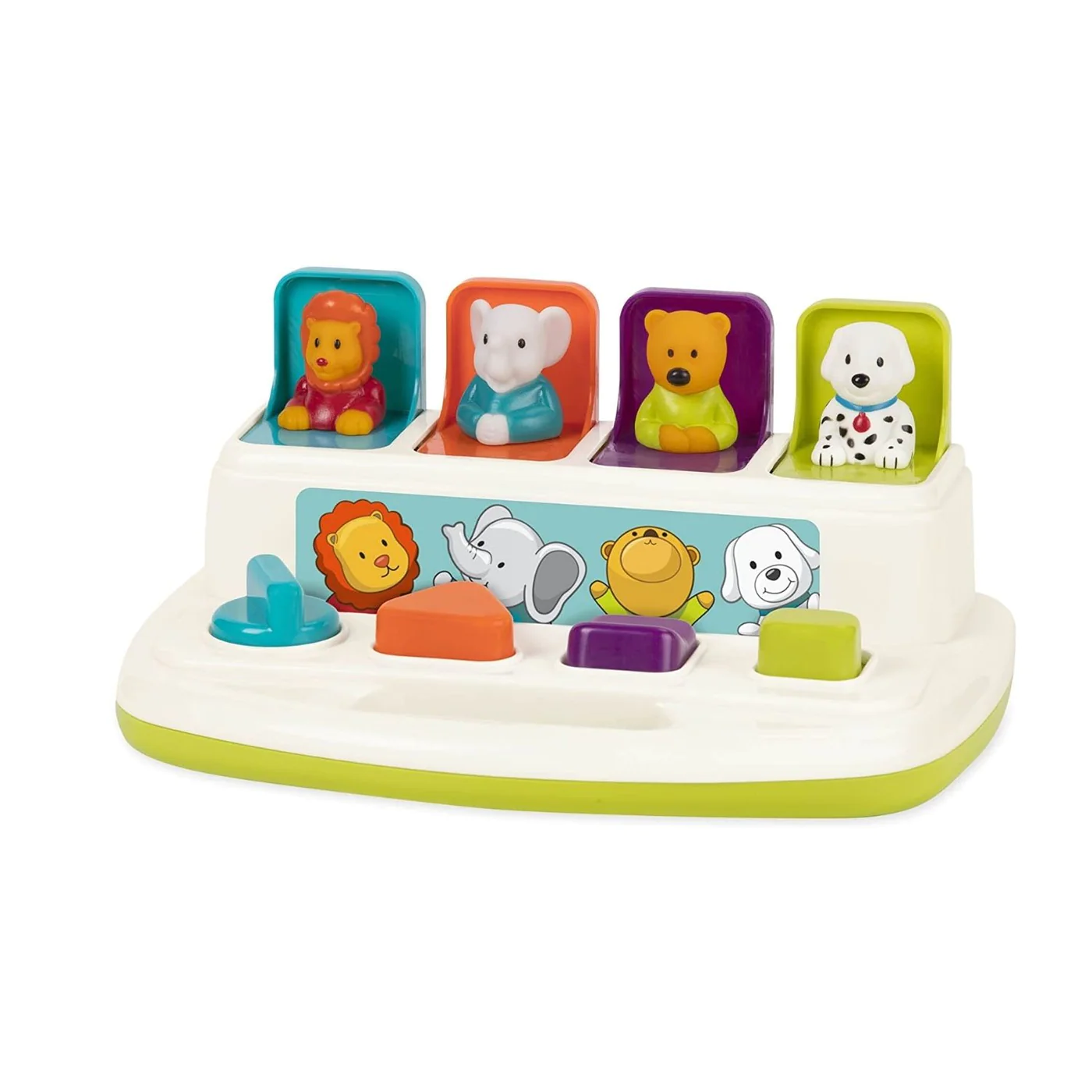 The Pop-Up Pals from Battat is a hands-on, pop-up toy with 4 friendly animals for babies and toddlers! Watch your child explore and discover animals, shapes, colours, and cause-and-effect action. Blue, orange, purple or green; push, turn, press or slide for a rewarding surprise! Each button has its own way to open. Colourful animals pop up at the push of a button: “SNAP!” Then, shut the door and do it all again: “CLACK!” Builds strong motor skills, and spend hours of educational play with this activity centre for babies and toddlers. This pop-up activity toy is easy to bring anywhere with the built-in handle. Ready, set, POP!