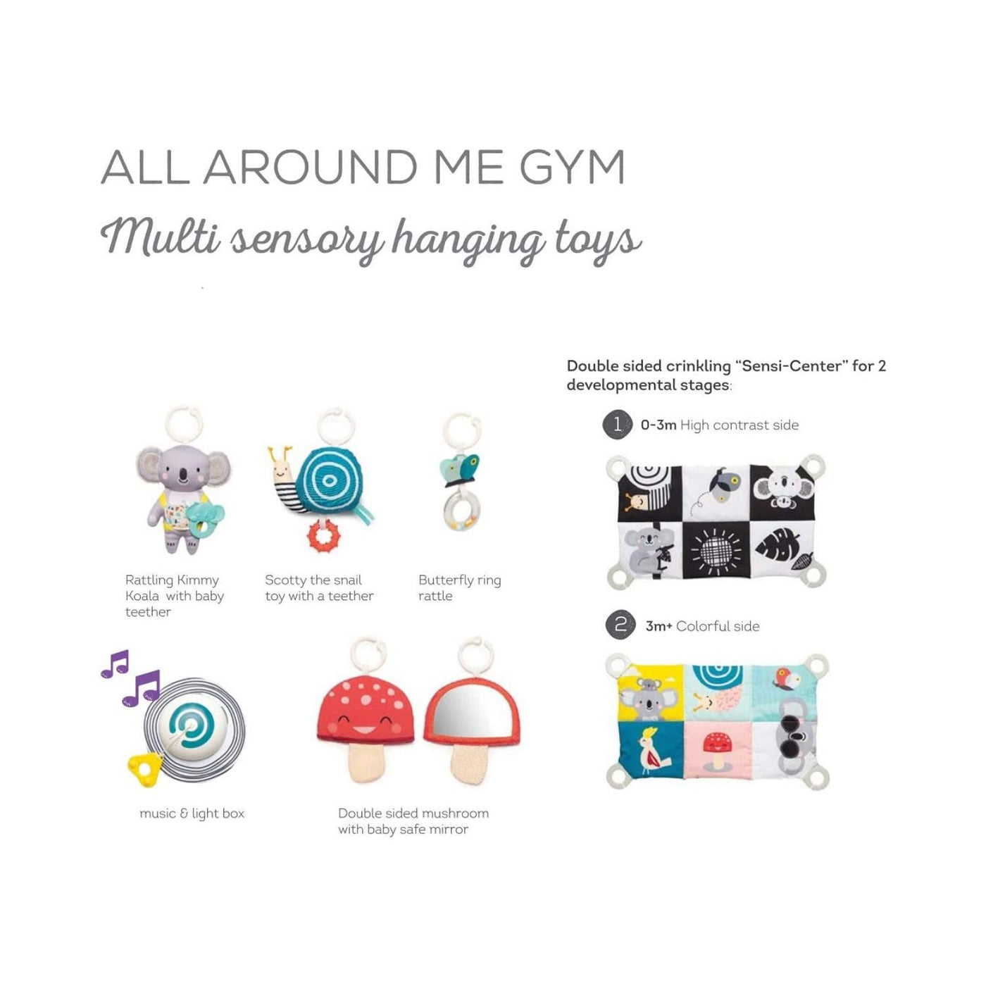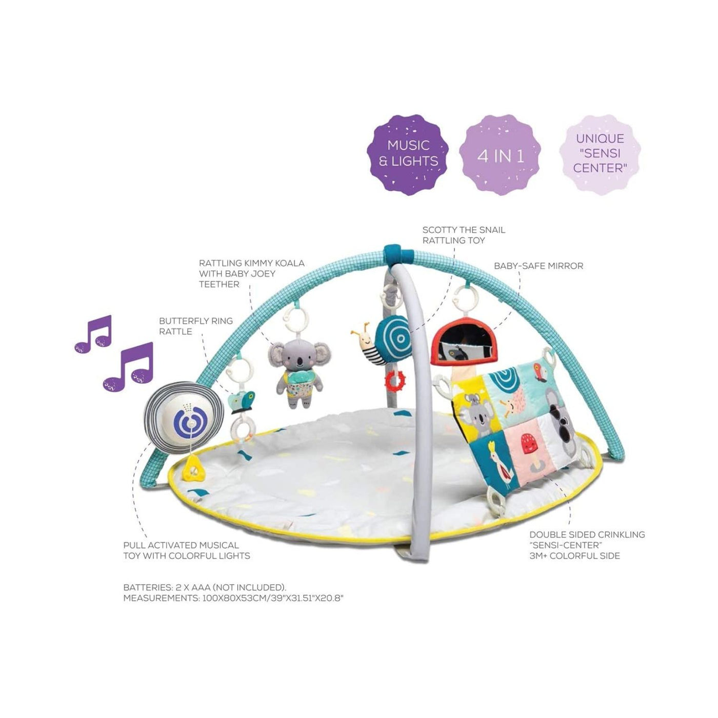• Includes five additional playful, multi-sensory hanging toys: double-sided crinkling “Sensi-center”, rattling Kimmy Koala with a baby teether, Scotty the snail toy with an additional teether, double-sided mushroom with baby safe mirror, butterfly ring rattle, and a musical toy with colourful lights