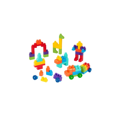 - 80-Piece Set: 80 colorful bricks, including 2 linking bases and 8 wheel pieces to get things moving.