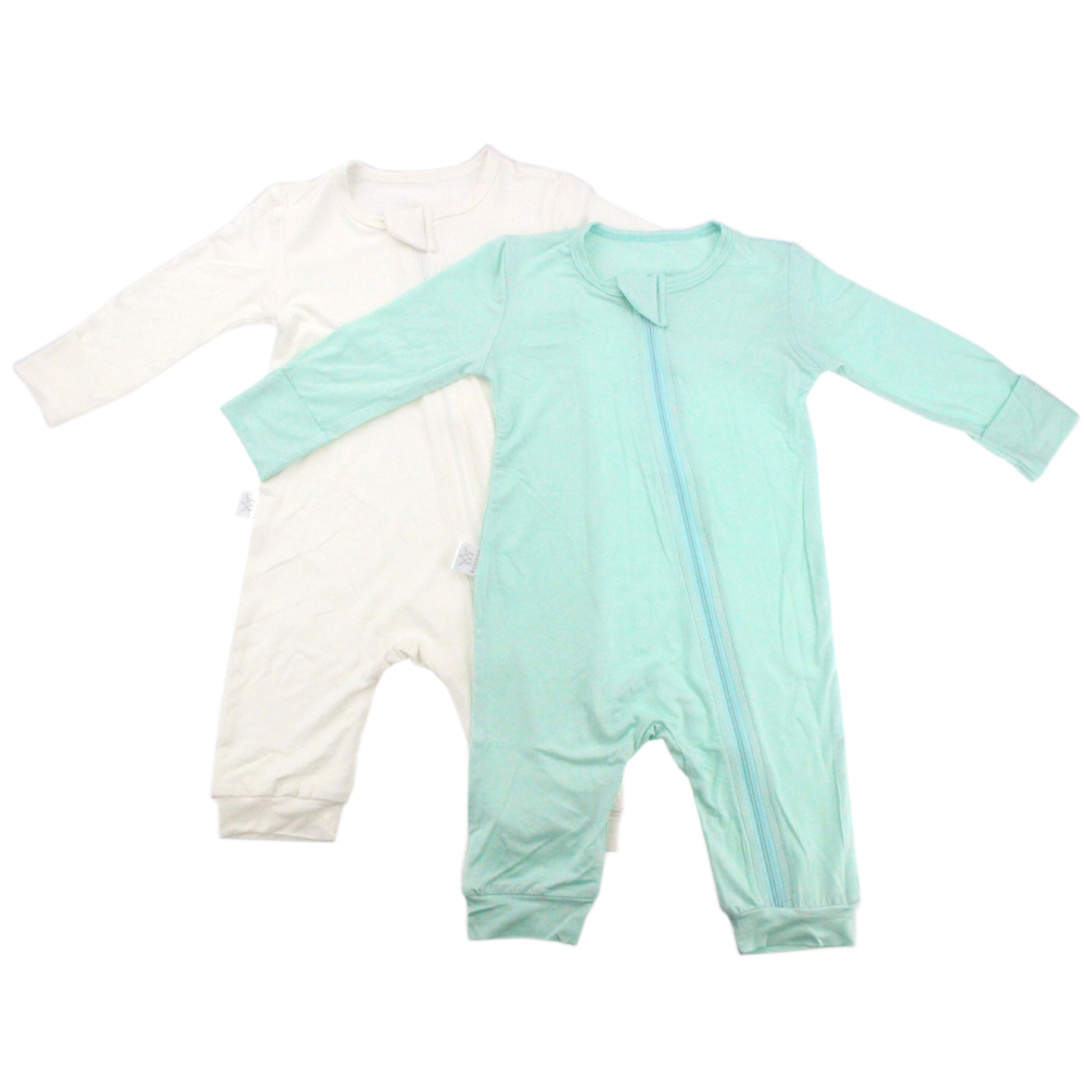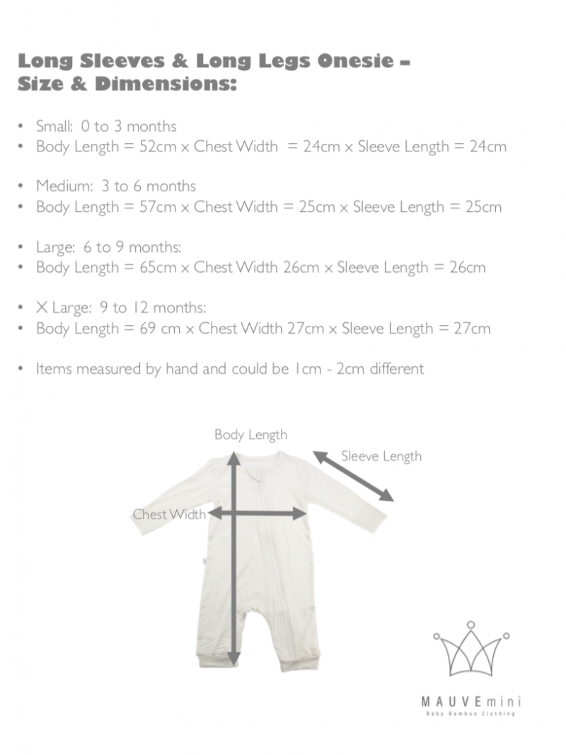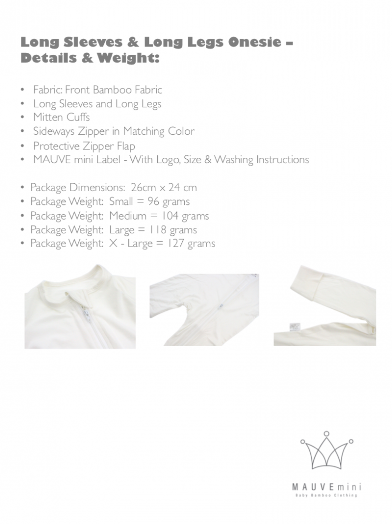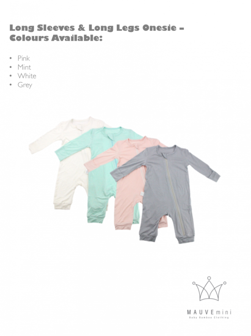 Baby Long Sleeve Onesie by MAUVEmini. Fabric is 95% bamboo & 5% elastane. Colours available: Grey, Mint, Pink and White. Sizes available: S, M, L and XL.