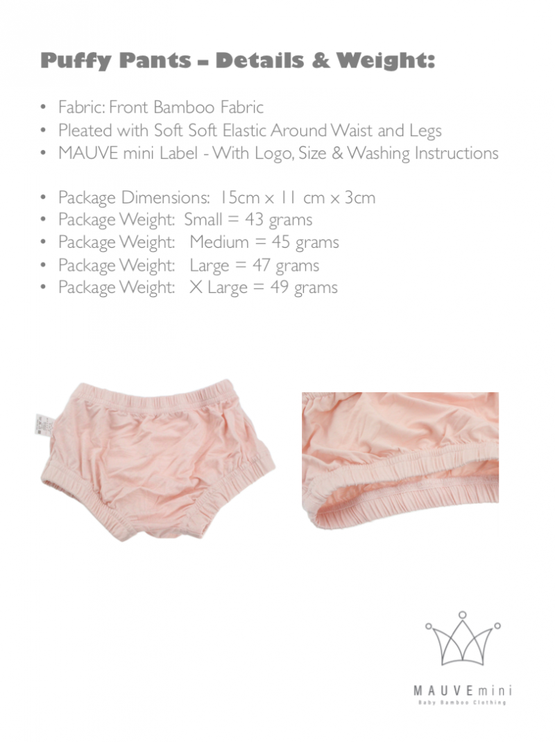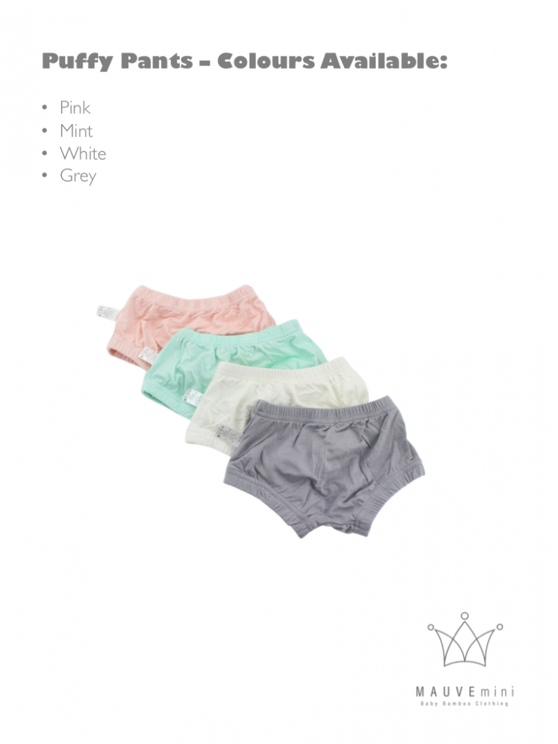 Baby Puffy Pants by MAUVEmini. Fabric is 95% bamboo & 5% elastane. Colours available: Grey, Mint, Pink and White. Sizes available: S, M, L and XL.