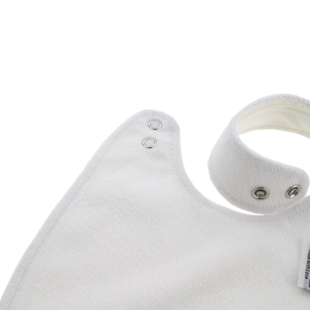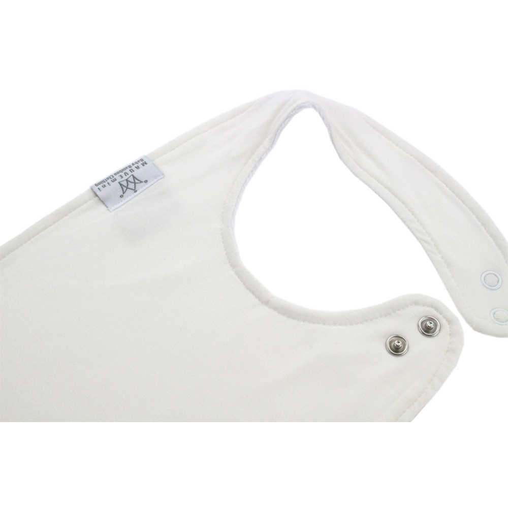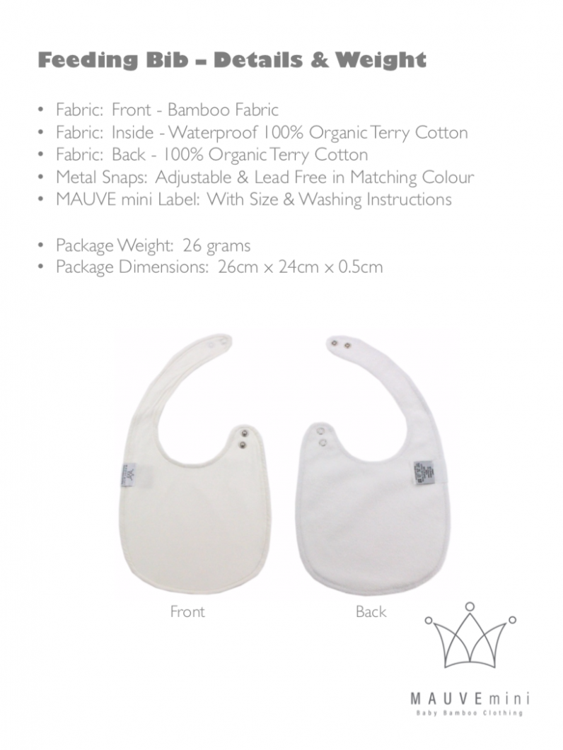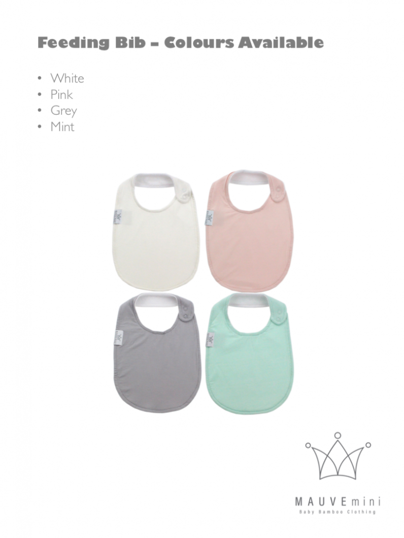Baby Round Feeding Bib by MAUVEmini. Front fabric is bamboo, middle is waterproof terry cotton lining and back is 100% organic cotton. Colours available: Grey, Mint, Pink and White. Sizes available: One size.