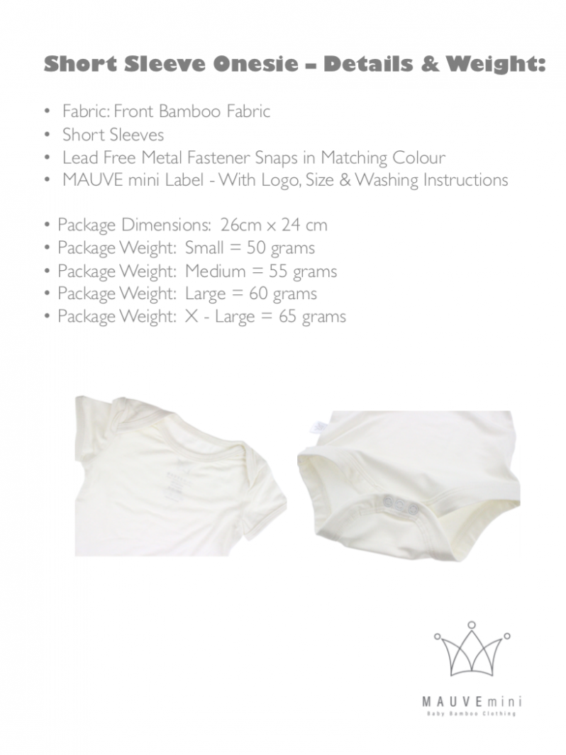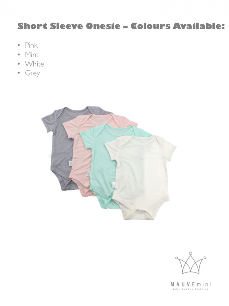 Baby Short Sleeve Onesie by MAUVEmini. Fabric is 95% bamboo & 5% elastane. Colours available: Grey, Mint, Pink and White. Sizes available: S, M, L and XL.
