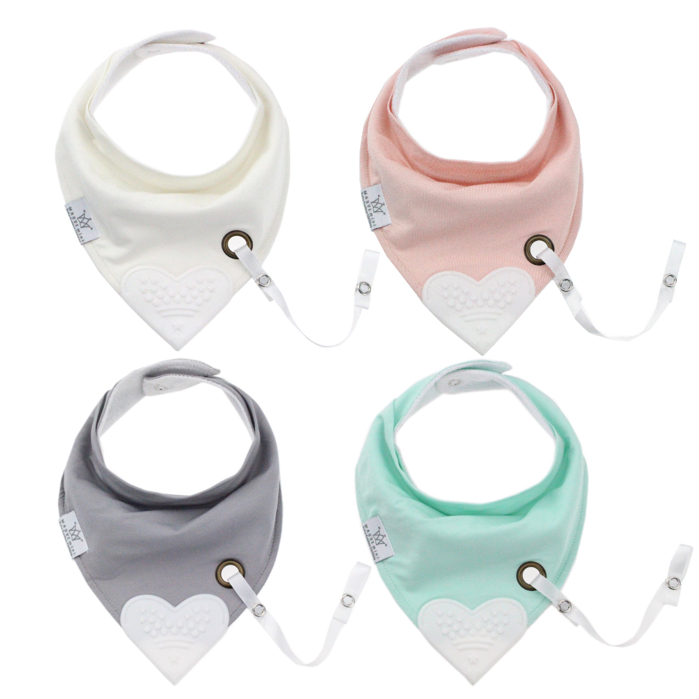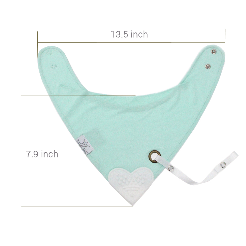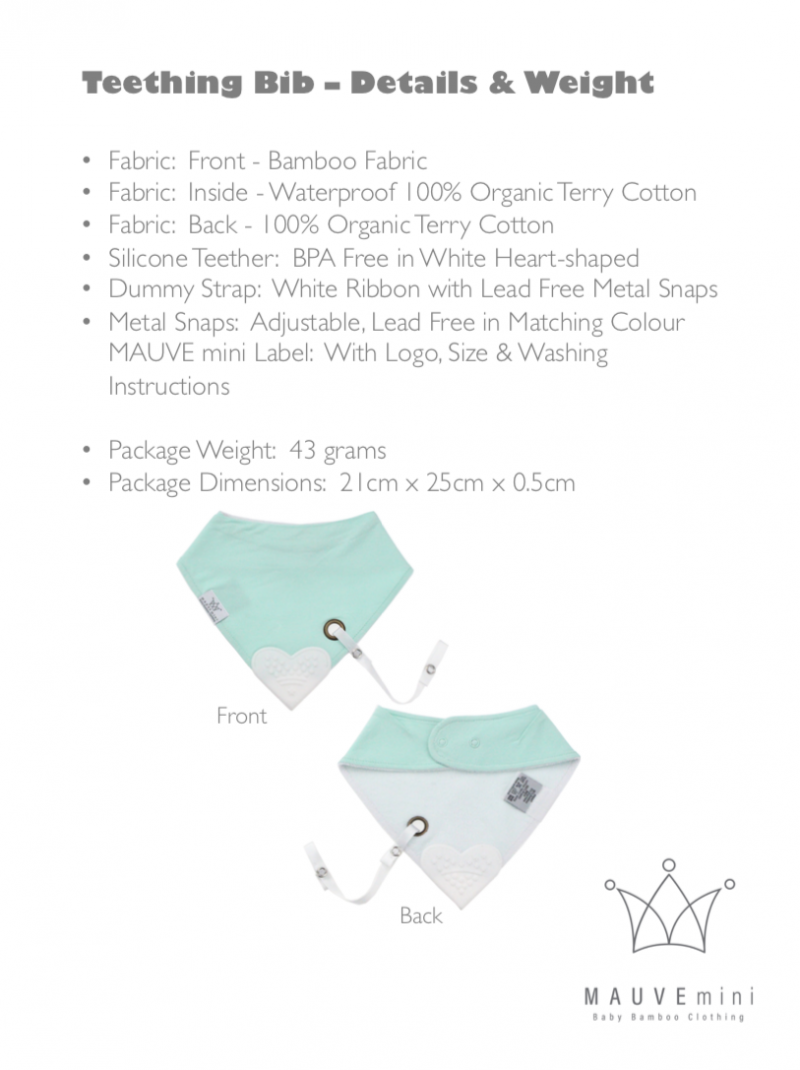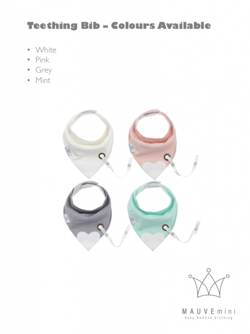 Baby Reversible triangle Bib with Heart Shape Teether and Dummy String. Front fabric is bamboo, middle is waterproof terry cotton lining and back is 100% organic cotton. Colours available: Grey, Mint, Pink and White. Sizes available: One size.