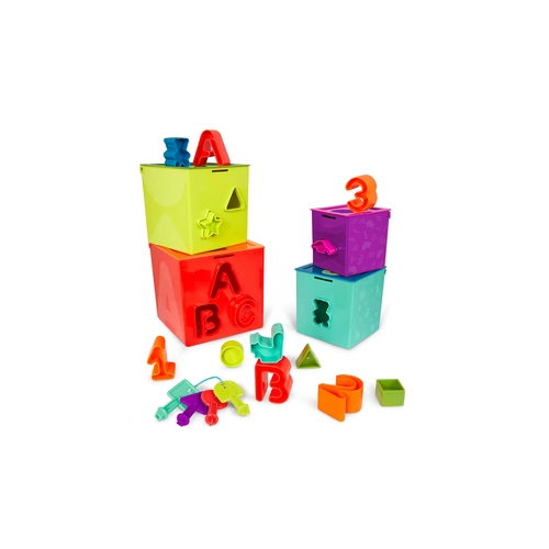 Battat Lock & learn activity cubes. This set of oversized nesting cubes features numbers, letters, and shapes. Kids can stack them, sort them, and play matching games while they improve their fine motor skills.