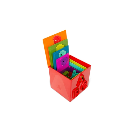 • 18-Piece Set: This activity box set includes 4 nesting cubes, 3 numbers, 3 letters, and 7 fun shapes for loads of sorting and stacking fun!