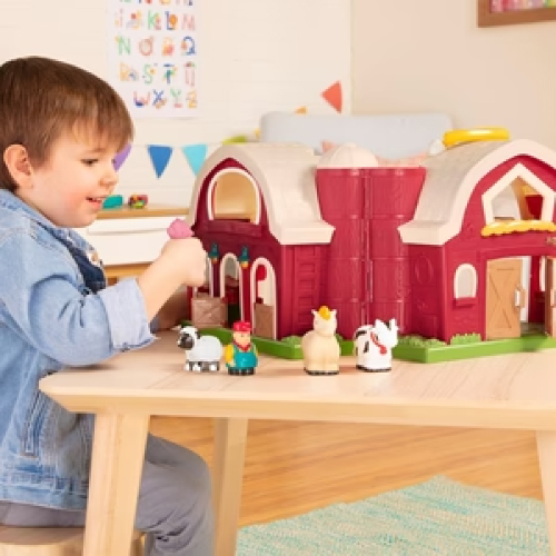 A true childhood classic, the Big Red Barn from Battat is sure to bring hours and hours of farm-inspired imaginative play directly in your living room. Farmer Ben and all his animal pals are ready for a day of adventures! Toy barn opens up and features a fold and go handle. Peek through the window and open the door to let the sheep in. Check on the second floor to see if the cow’s still snoring! That same second floor features a cozy nest, which is the best hiding spot for all your chocolate eggs. Corn is ready in the feeder for everyone that’s hungry. Did you spot the little mouse? She’s been driving Farmer Ben crazy! All doors are easy to open (even for teeny tiny hands) and will click into position when you close them. This kid’s farm set is just the right size for little hands with toy farm animals that are easy to grab and hold. This play farm also promotes sensory play with gorgeous colors and plenty of sensory textures; also, a great way to encourage imaginative and pretend play.