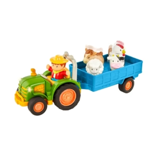 Take a ride around the farm with the Farming Fun Tractor by Battat! This tractor toy comes with a detachable trailer, farmer, horse, sheep, cow, and chicken for hours of imaginative pretend play. Seat your barnyard friends in the trailer, then watch them move up and down as you push it forward! All the pieces are easy for tiny hands to hold, push, and play with, making them great for developing fine skills. This farm toy also comes with lights and sounds to boost your little one’s sensory development—just press down on the seated farmer to activate the headlights, animal sounds, and a fun song! Sing, bounce, laugh and play all around the farm with this tractor toy. Made of worry-free and durable materials.