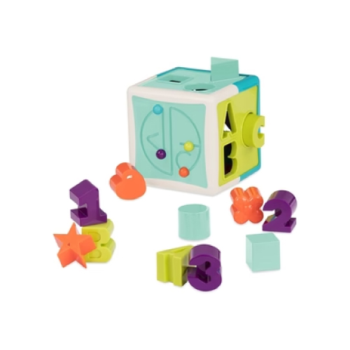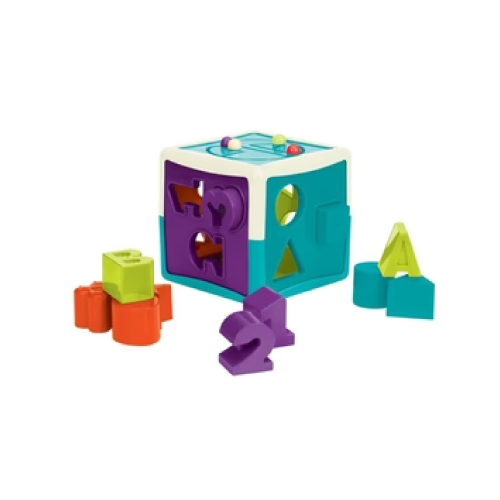 The Shape Sorter Cube from Battat comes with 6 sides of educational fun, 12 different shapes, and a bead maze! Curious kiddos will learn their ABCs and 123s while improving their matching and sorting skills. All of the chunky shapes are easy for little hands to hold and they store neatly in the sorter cube. Soft flaps at the bottom allow the shapes to slide out with just a little shake! Match each piece to its place and play with 4 colourful beads – little hands will love to slide them along the grooved maze!