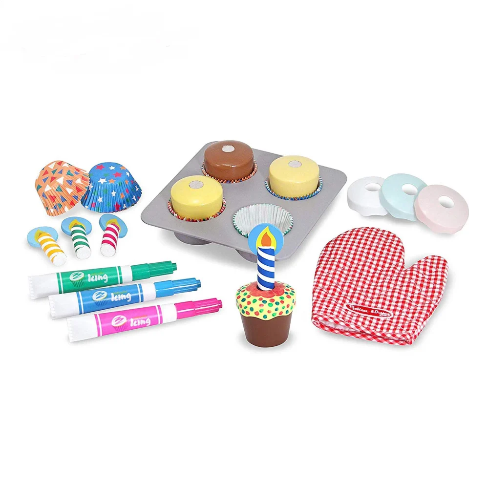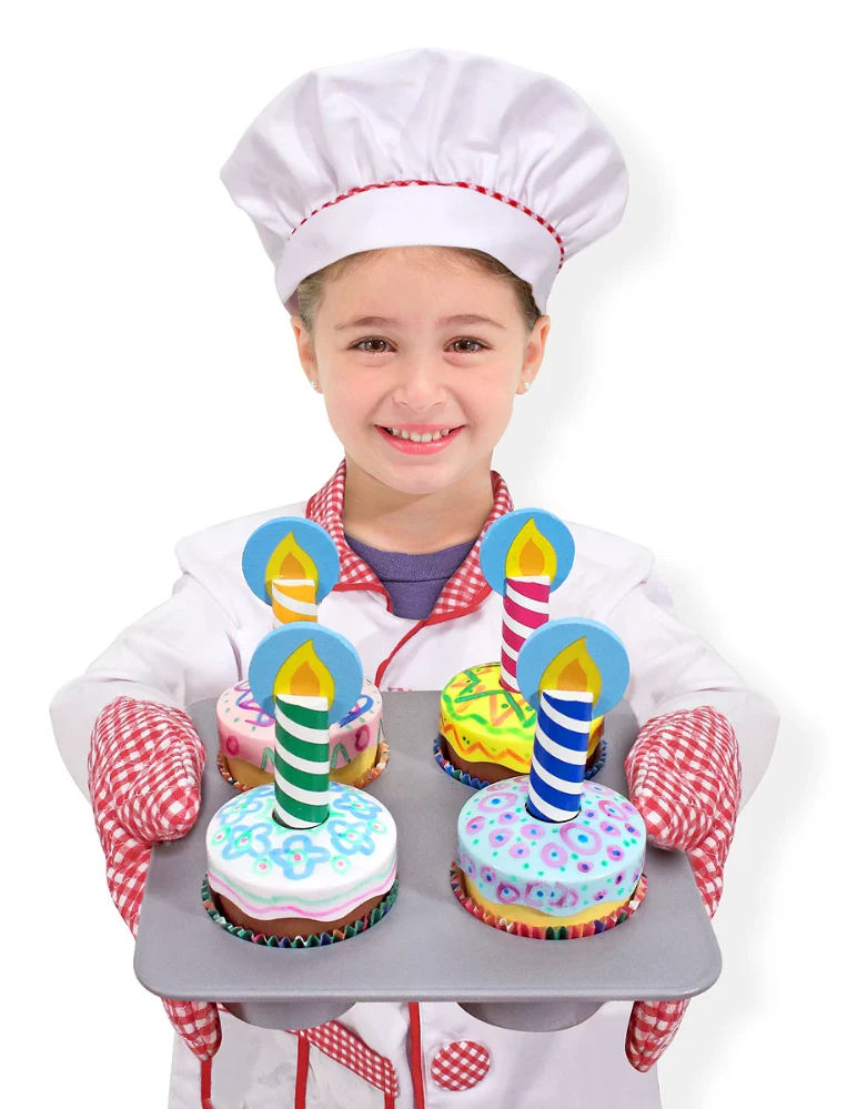 - 4 cupcakes, 4 cupcake tops, 8 cupcake sleeves, 4 candles, baking tray, and oven mitt