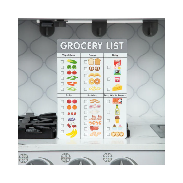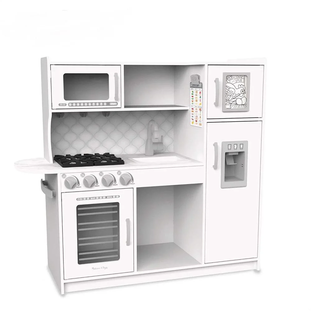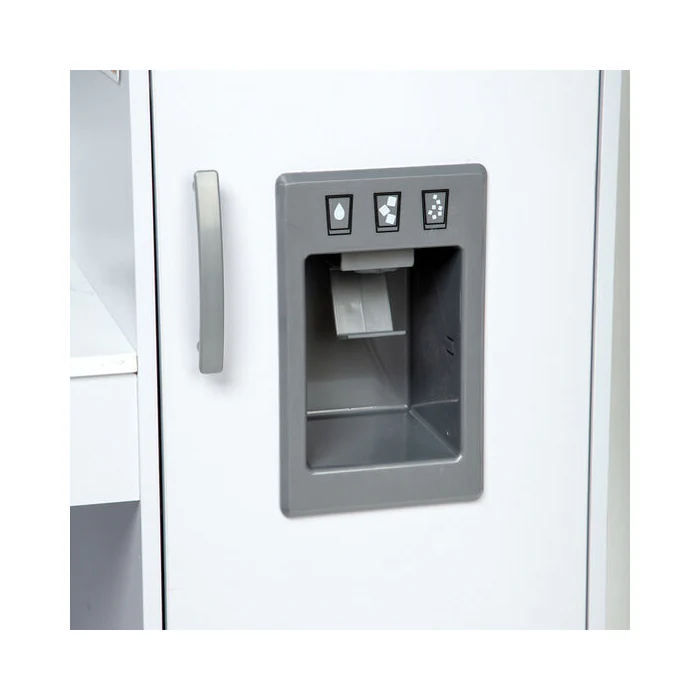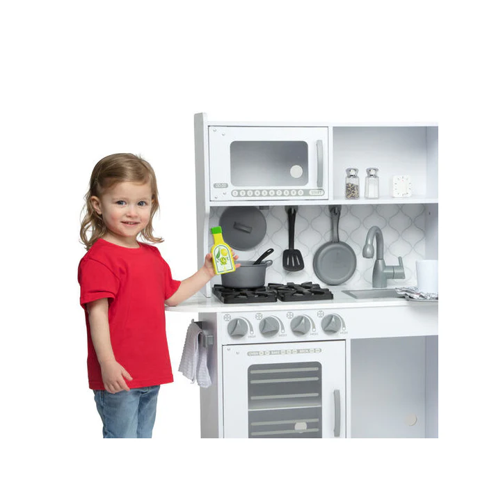 Budding young chefs can hone their craft in this beautifully designed, white marble-colored modern play kitchen! The easy to assemble chef’s kitchen includes a refrigerator/freezer with innovative working ice maker that dispenses two included “ice cubes,” an oven and stovetop with dials that turn, microwave with turning plate, sink with moving faucet and handle, grocery check list, movable hooks, and ample shelving and storage for easy cleanup. Detailed, illustrated instructions make this kitchen simple to put together. Assembled, it stands approximately 3.5 feet (1 meter) long and more than three feet (0.9 meters) high, roomy enough for multiple kids to play at once. Sturdy, top-quality wooden construction means it will stand up to years of creative make-believe meal-making!