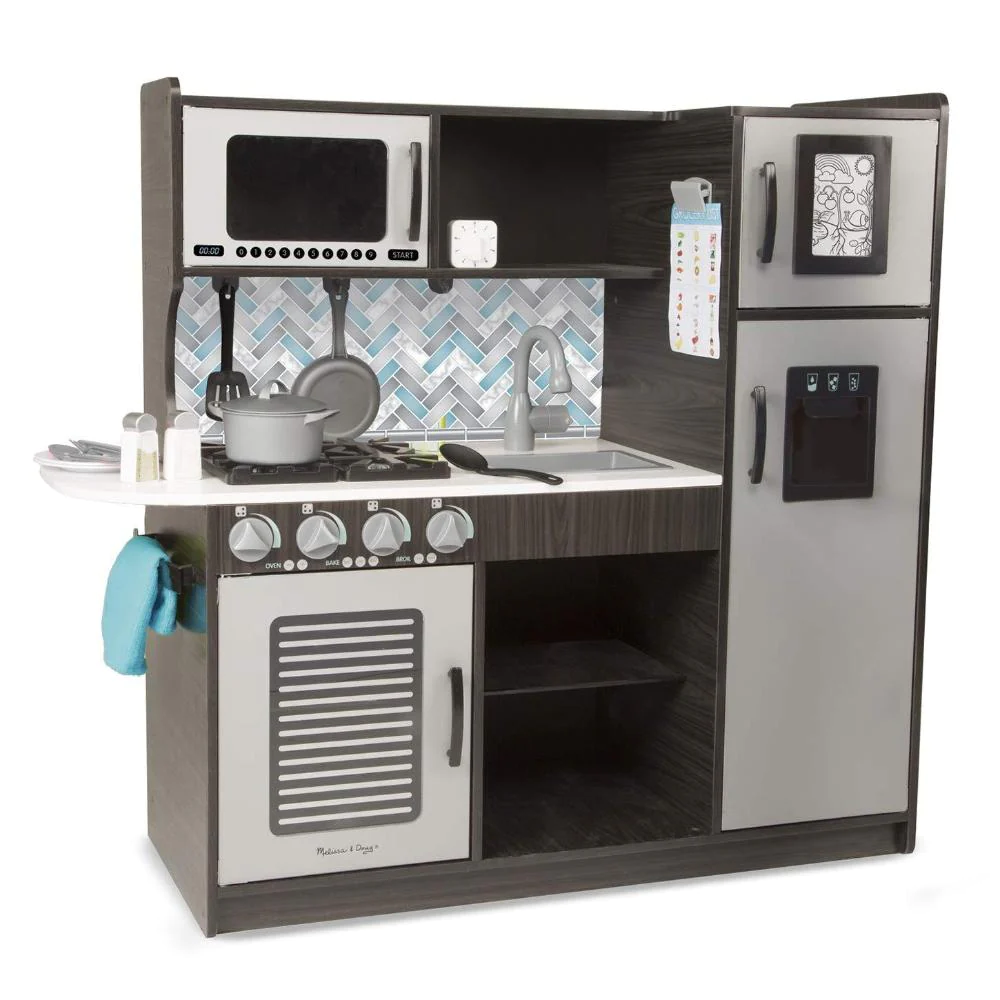 Budding young chefs can hone their craft in this beautifully designed, charcoal-colored modern play kitchen by Melissa and Doug. The easy to assemble chef’s kitchen includes a refrigerator/freezer with innovative working ice maker that dispenses two included “ice cubes,” an oven and stove top with dials that turn, microwave with turning plate, sink with moving faucet and handle, grocery checklist, movable hooks, and ample shelving and storage for easy cleanup. Detailed, illustrated instructions make this kitchen simple to put together. Assembled, it stands approximately 3.5 feet (1 meter) long and more than three feet (0.9 meters) high, roomy enough for multiple kids to play at once. Sturdy, top-quality wooden construction means it will stand up to years of creative make-believe meal-making! Accessories sold separately.