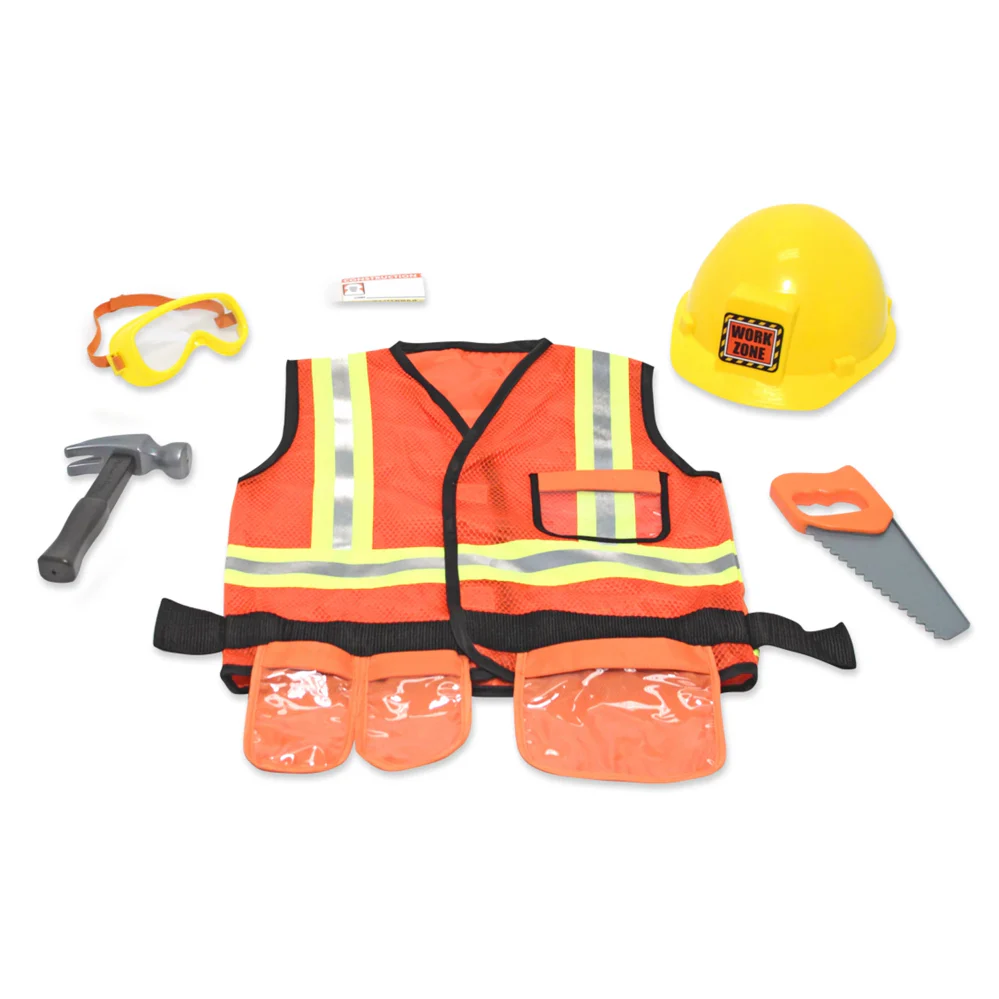 - Includes vest with tool belt, hard hat, goggles, hammer, saw and name tag for pencil personalization.