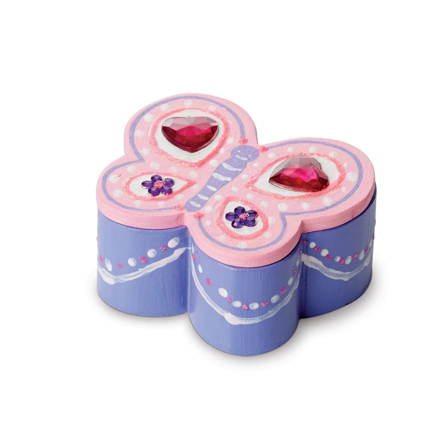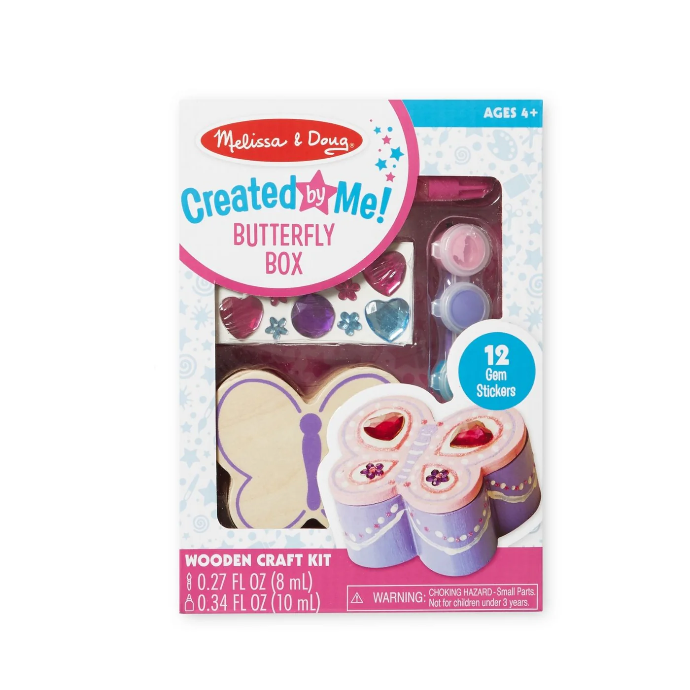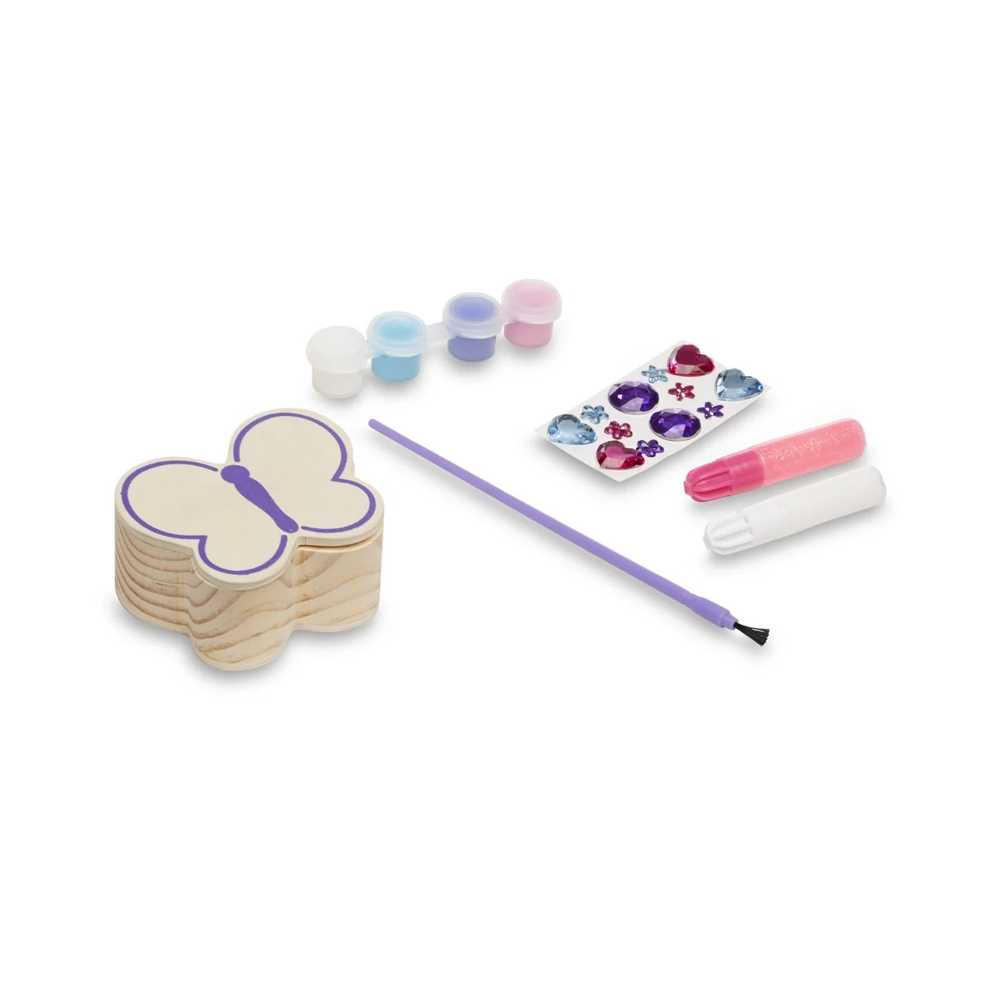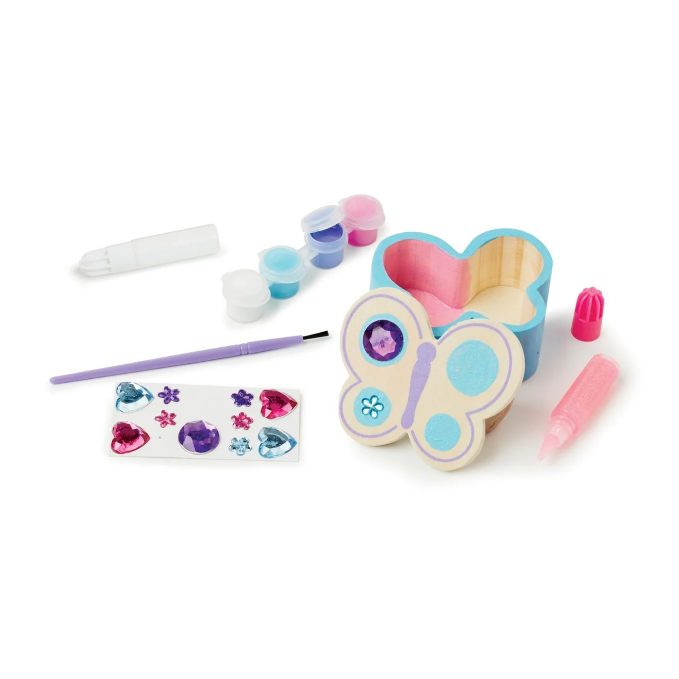 - Includes wooden butterfly box, 12 gem stickers, 4 pots of paint, paintbrush, glitter glue, and white glue
