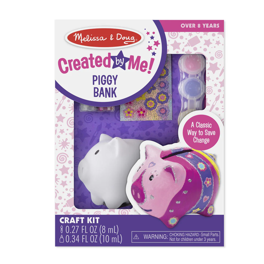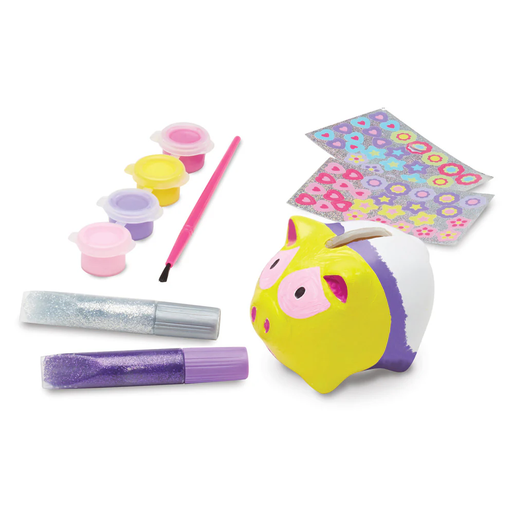 - Includes a piggy bank, glitter glue, colorful stickers, 4 pots of paint and a brush.