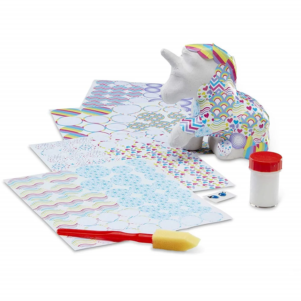 Creating the perfect patchwork pal has never been so fun, fast, and easy! Pre-cut round stickers in different sizes and eight coordinating patterns are mess-free and simple to press onto the adorable paper-maché animal figure. Overlap to create one-of-a-kind designs, then use the foam craft brush to coat with glitter decoupage glue.