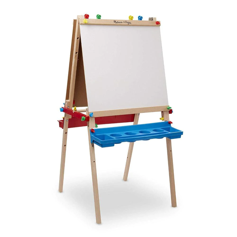 The Melissa & Doug Easel makes any room into an art studio! Our double-sided, adjustable-height, kid-sized art easel includes a dry-erase board, chalkboard, locking paper-roll holder (fits either an 18″” or 12″” wide paper roll), child-safe paper cutter, four easy-grip clips, and a plastic tray to attach to each side of the Deluxe Standing Easel. Assembly is easy, so there’s little waiting for the next masterpiece! Children’s easels are recommended for building fine motor skills and proper pencil grip–great for beginning writers! Use the chalkboard and whiteboard surfaces of our wooden easel as the ideal practise surface for a child’s first letters and words. Paint, paint cups, and paint brushes sold separately.