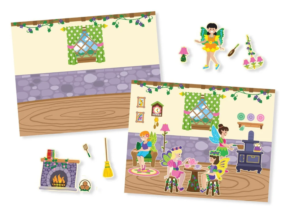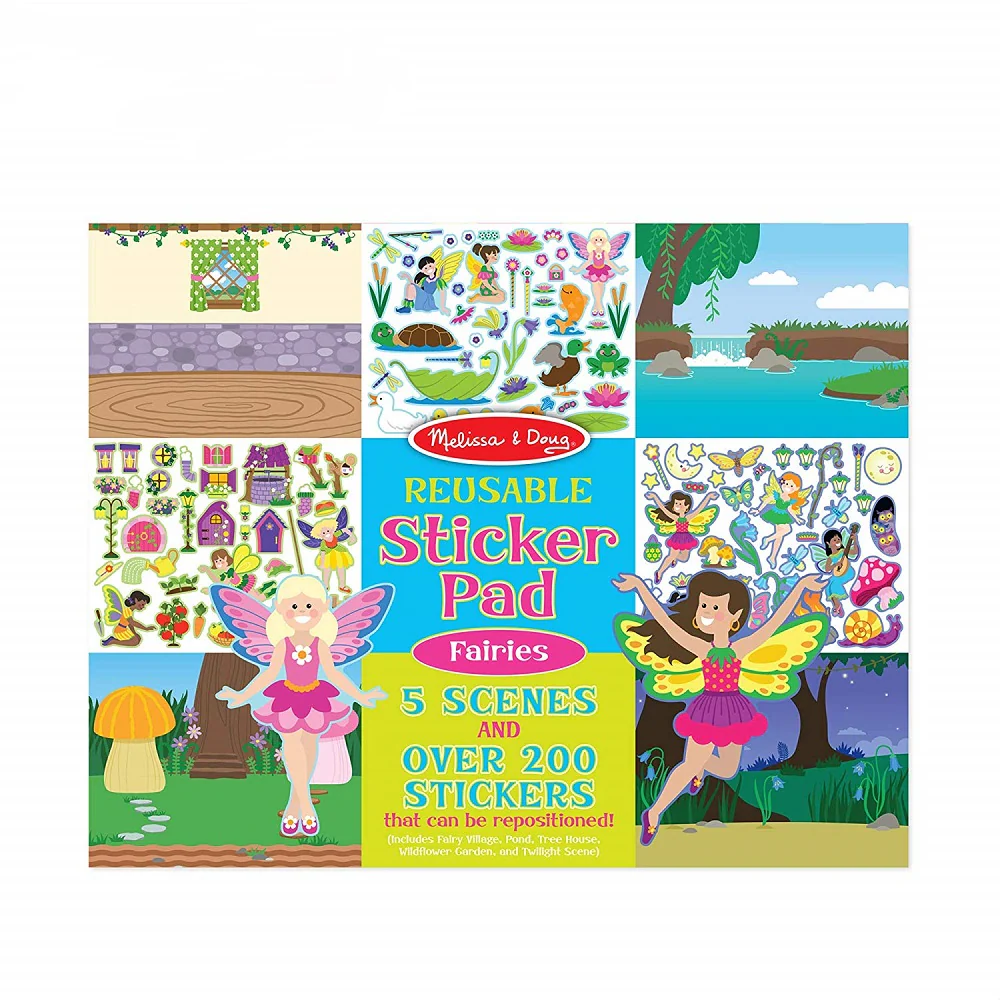 Five reusable backgrounds set the stage and over 165 enchanting stickers add the fun! This reusable fairy sticker activity pad let kids create perfect pixie pictures, using fairies, flowers, glowing lanterns, friendly bugs, and more to decorate and fill each oversize scene. All five scenes (fairy village, pond, tree house, wildflower garden, and twilight scene) and coordinating sticker pages are bound into a handy oversize pad for portability and storage, and also tear our cleanly for easy sharing and display. (The rigid cardboard back makes it a great laptop activity for the car or airplane, too!) Pass them around to let up to five kids sticker their scenes at once, or take your time creating a whole fairy world, page by page. The reusable pieces mean it’s simple to reposition the fairy stickers to tell a changing story, reimagine a scene, and have lots of creative fun, time after time!