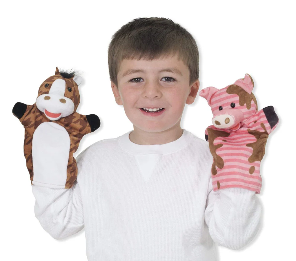 This happy herd of simple hand puppets by Melissa & Doug, is a great way to lend a hand to kids who are learning to express themselves. Sized to fit both adults and children, these puppets are perfect for role-playing and story-telling. The set features four themed fabric puppets (farm friends include a sheep, cow, horse, and pig) that are machine washable and made of quality, long-lasting material. Each has a soft plush head and is decorated with a detailed, brightly colored outfit to engage the senses and engage the imagination. Puppet play inspires countless creative stories and amazing imaginary adventures. These simple glove puppets fit children and adults and are easy to use, so even the littlest puppeteers can see exciting movement with very little skill — terrific for self-confidence, and also an invaluable booster for motor skills and communication skills. Let these cuddly characters help children act out scenes, tell stories, practice new words, and talk about emotions. These hand puppets are a playful way to build vocabulary, dexterity, creativity, and imagination!