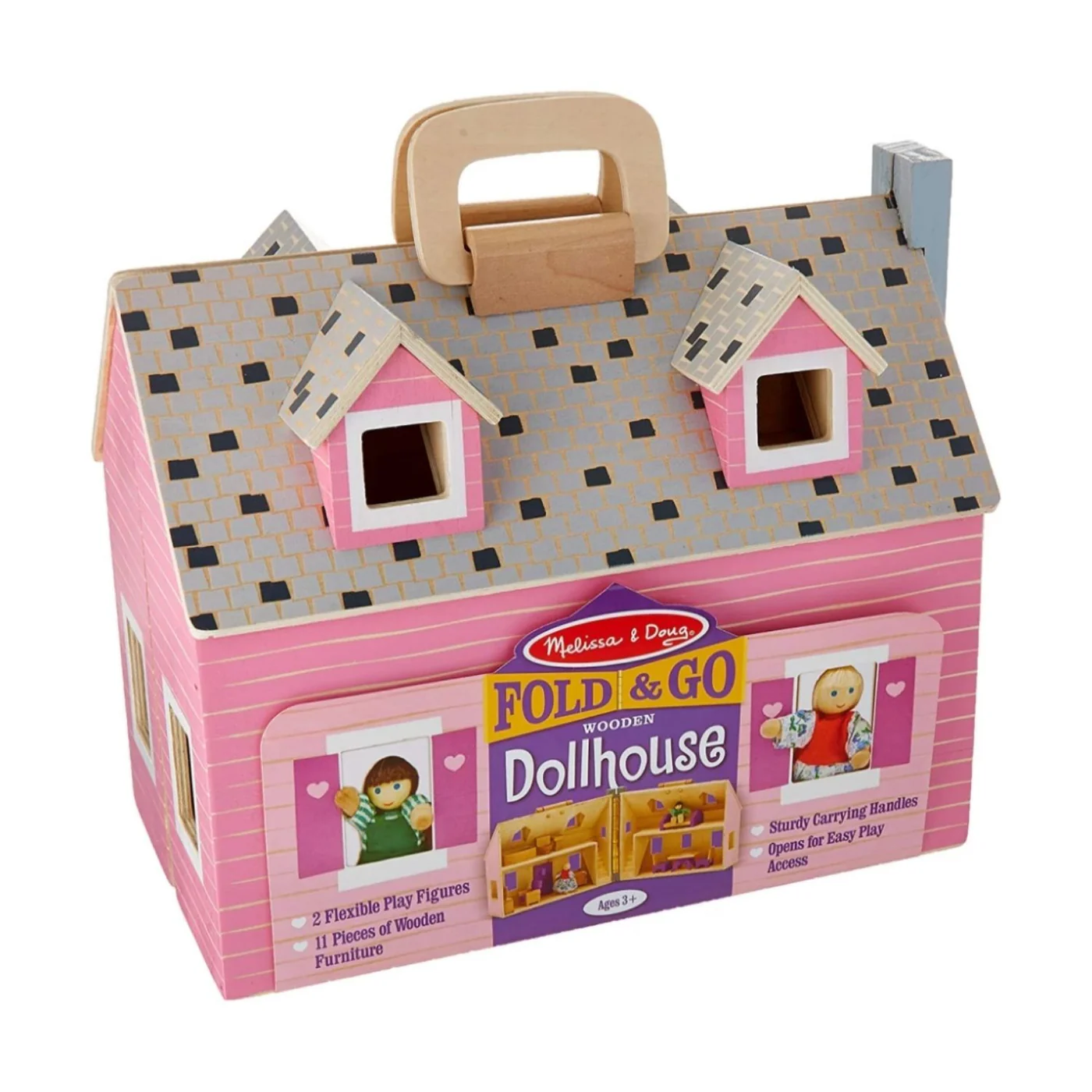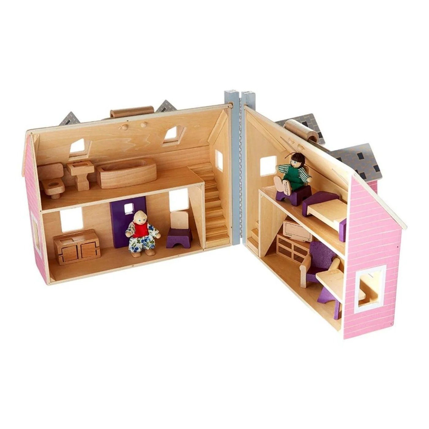 This beautifully detailed, built-to-last wooden dollhouse comes with a hinged door to let the play figures in and out. Children can arrange the furniture (2 chairs, a table, armchair, bathtub, sink, toilet, TV stand, TV, bed, and stove), make up stories about the people who live in there, work on counting by adding up the rooms (or windows, or stairs in the staircase), and study shapes by locating all the squares, hearts, triangles, etc. Great for imaginative play, storytelling, and fine motor skills.