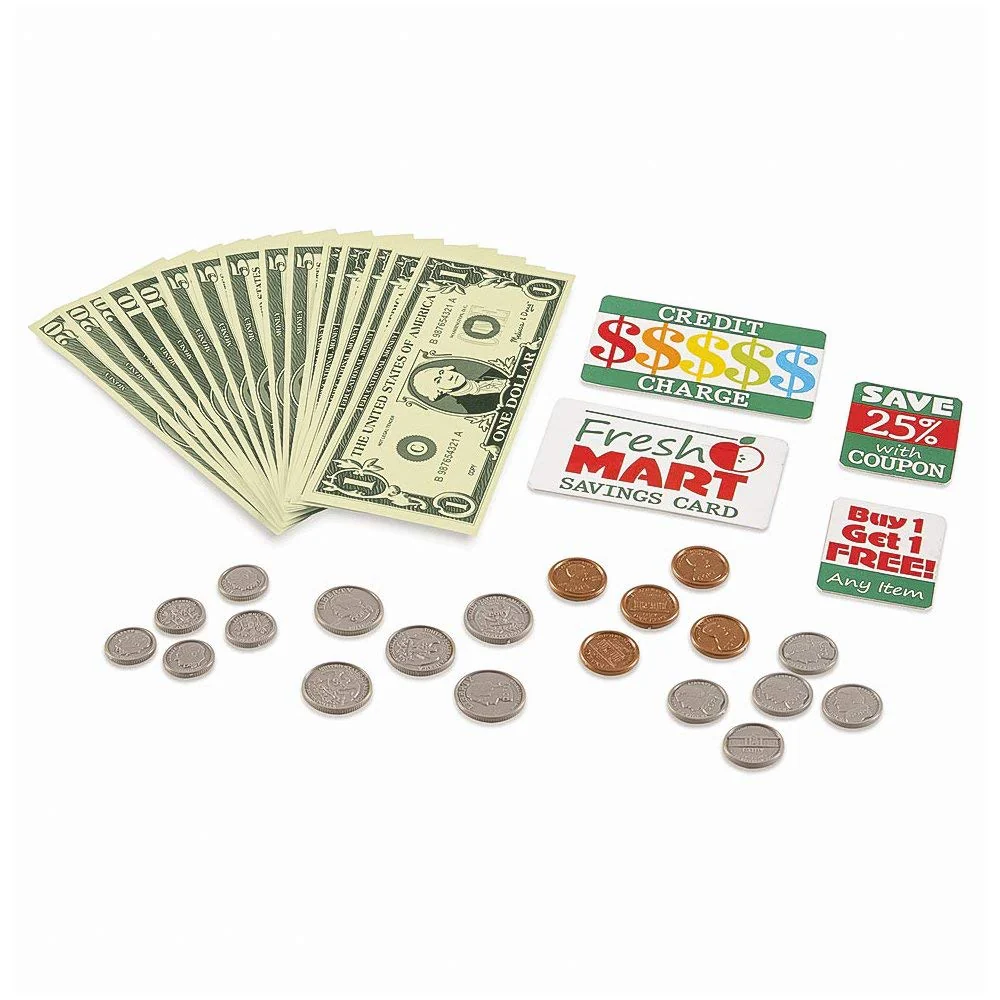 • Role play items include apron, conveyor belt divider bar, shopping bag, play money, cards, coupons