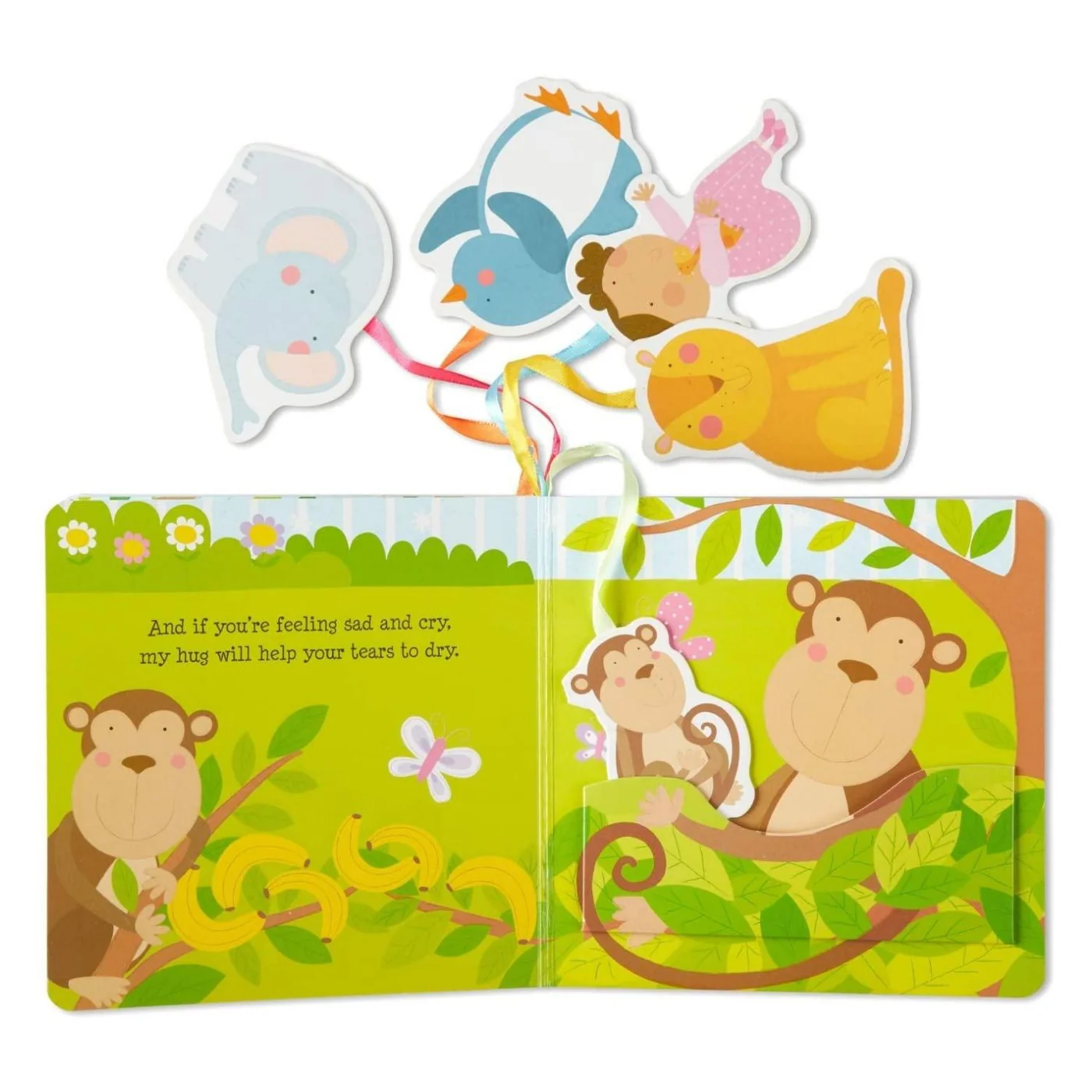 The perfect book for bedtime or any time kids need a hug! Kids will love tucking each baby animal into the loving hug of its parent as they read along with this illustrated 12-page board book with pockets on each spread. Five play tags (penguin, lion, elephant, monkey, baby) are attached to the book with colorful ribbons. Tuck the tags into the pockets near the arms of the matching grown-ups to put them as they read words of encouragement and comfort. Tags store in a pocket at the front of the book between readings.