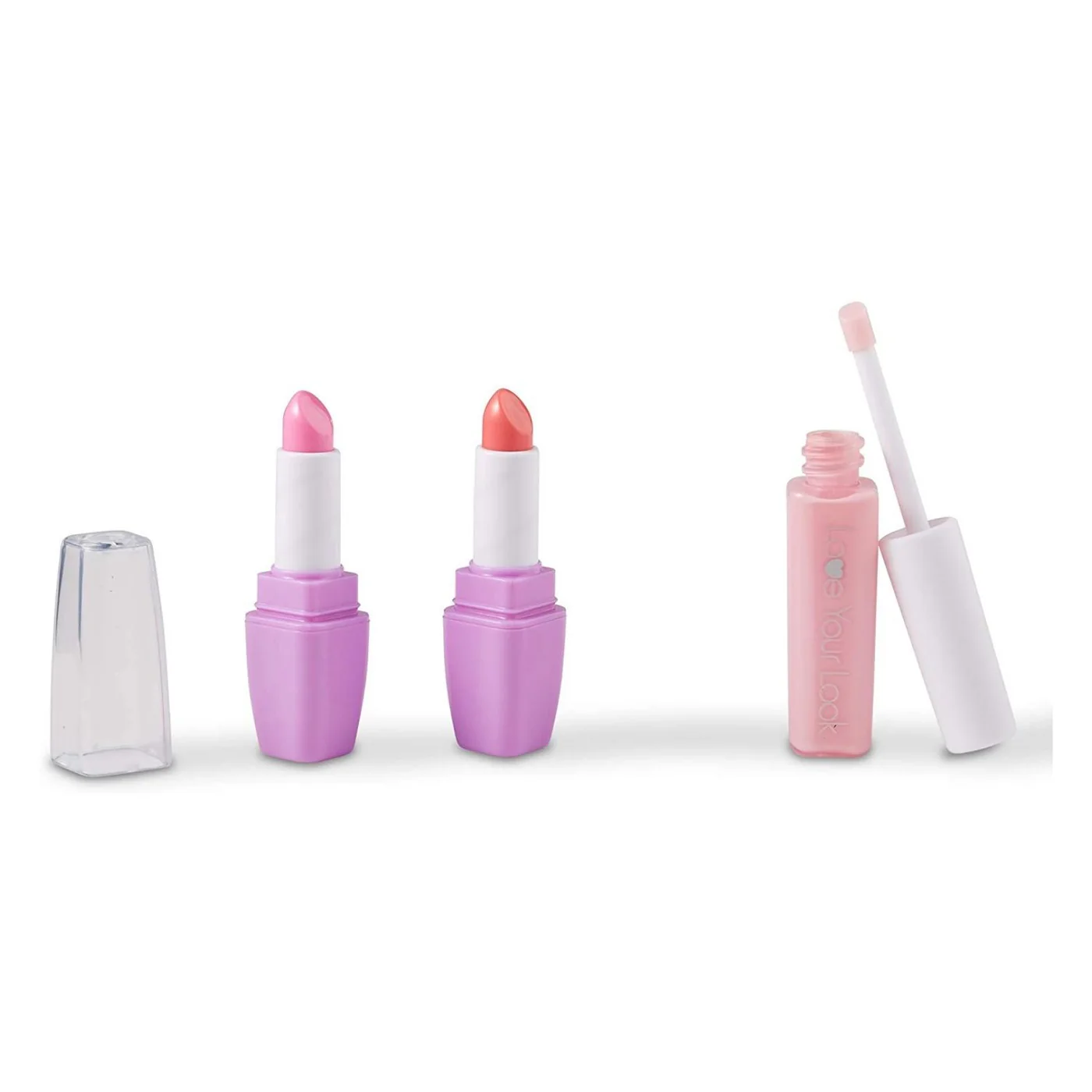 Perfect for mess-free imaginative play, THIS SET DOES NOT CONTAIN REAL COSMETICS. The 16-piece play set gives kids everything they need to play makeup artist and to practice daily skincare and makeup routines! Application brushes and play accessories for eyes, lips, and face, including an empty foundation pump bottle, compacts for pretend blush, powder, and glitter, pretend gloss and lipsticks, and a play eye shadow palette, let kids imagine different looks. Accessories look real but are toys–items do not contain cosmetics and no color is transferred, giving countless hours of mess-free imaginative play! Everything, including 2 cloth makeup wipes in a resealable pouch and a reusable activity card, stores in a portable, durable makeup kit with a built-in mirror! Role-playing real-life experiences with Love Your Look playsets is a great way for kids three and older to build confidence, empathy, and self-esteem.