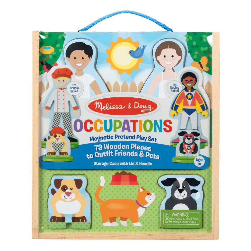 Combine dozens of wooden magnetic pieces in coordinating designs to outfit two double-sided friends and their dogs! Mix and match wooden magnetic clothing and accessories to get the characters ready for work or adventures (doctor, chef, astronaut, construction worker, superhero, pirate, knight, cowboy/cowgirl, firefighter, police officer). The play figures, each with a durable stand for pretend play, and the magnets all store in a sturdy wooden tray with a slide-in lid and convenient carrying handle to take the fun on the go! This unique dress-up dolls set helps kids three and older develop hand-eye coordination and fine motor, counting, and sorting skills, and encourages creative expression and imaginative play.