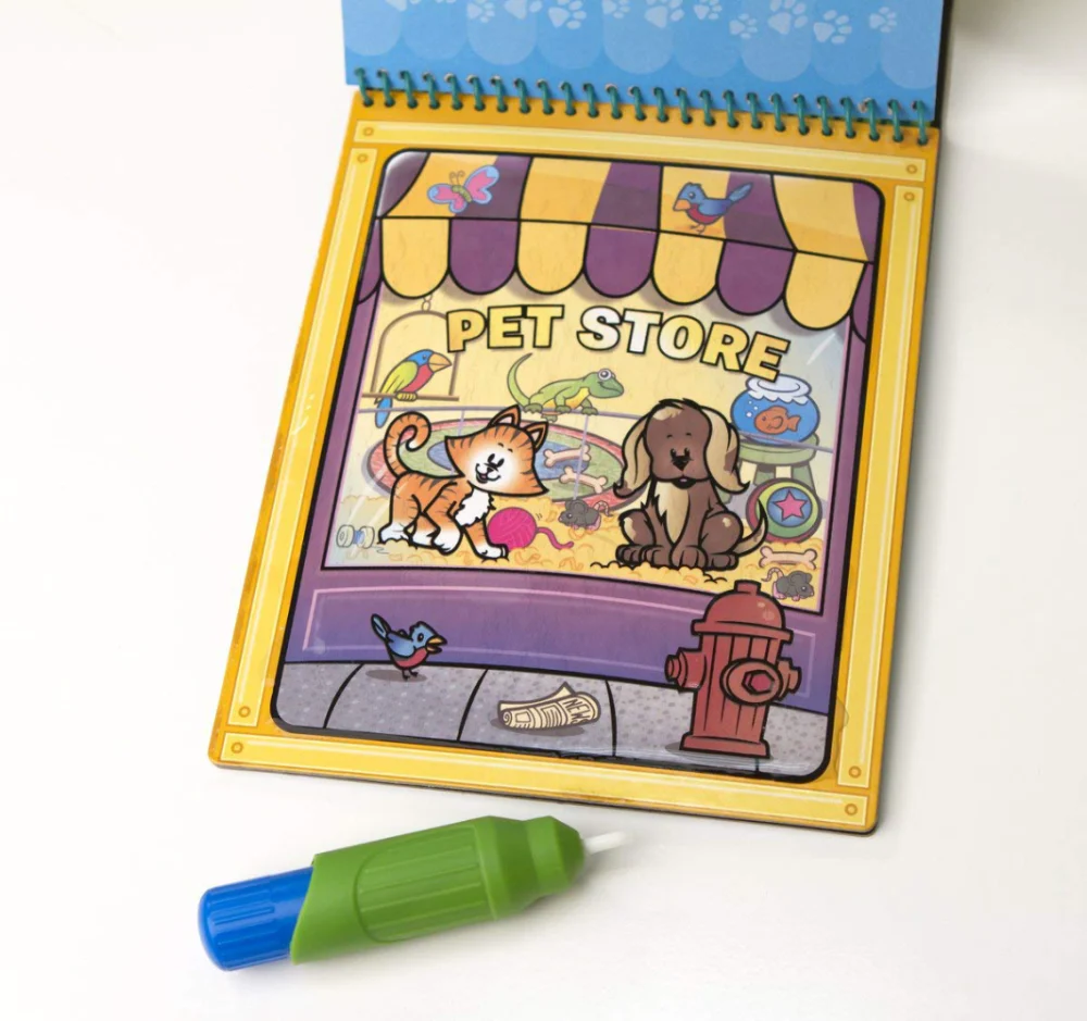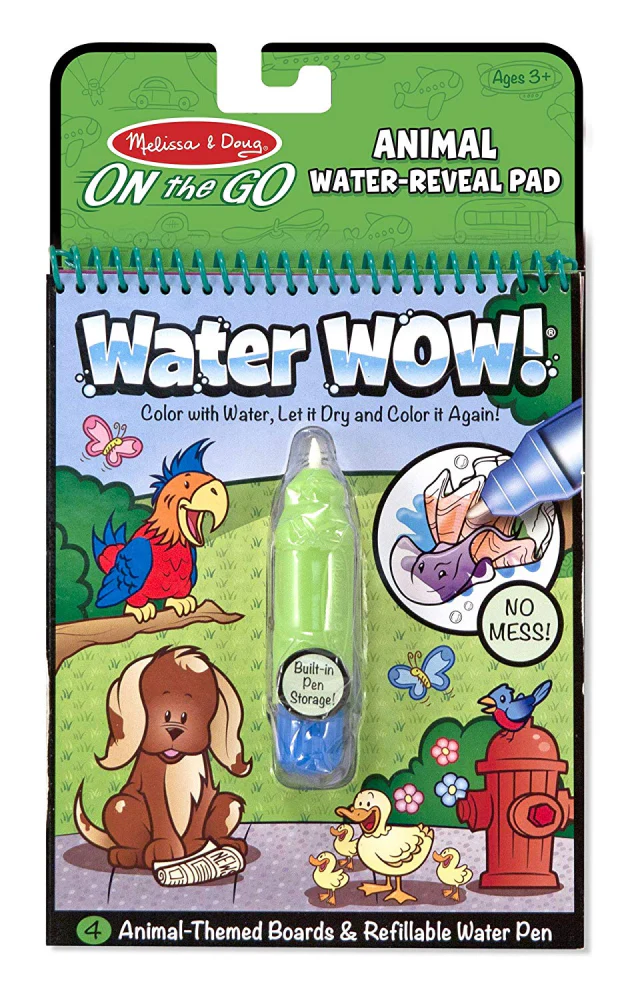 No-mess painting for kids! This exciting paint-with-water coloring book includes four reusable pages and a refillable water pen. Simply use the pen to color in each scene–details and vibrant color appear with every stroke! Then let the page dry to erase the pictures and fill it in again and again. This animal-themed book includes four scenes to color, and a search-and-find activity for each scene. The chunky-sized water pen is easy for kids to hold and stores neatly right in the front cover, so Water WOW books make ideal travel activity books and travel toys for kids!