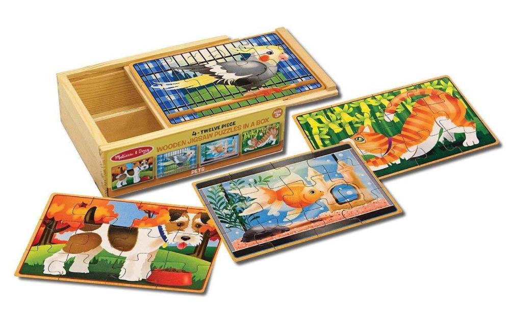 - Four wooden jigsaw puzzles: a fish, a dog, a cat, and a bird