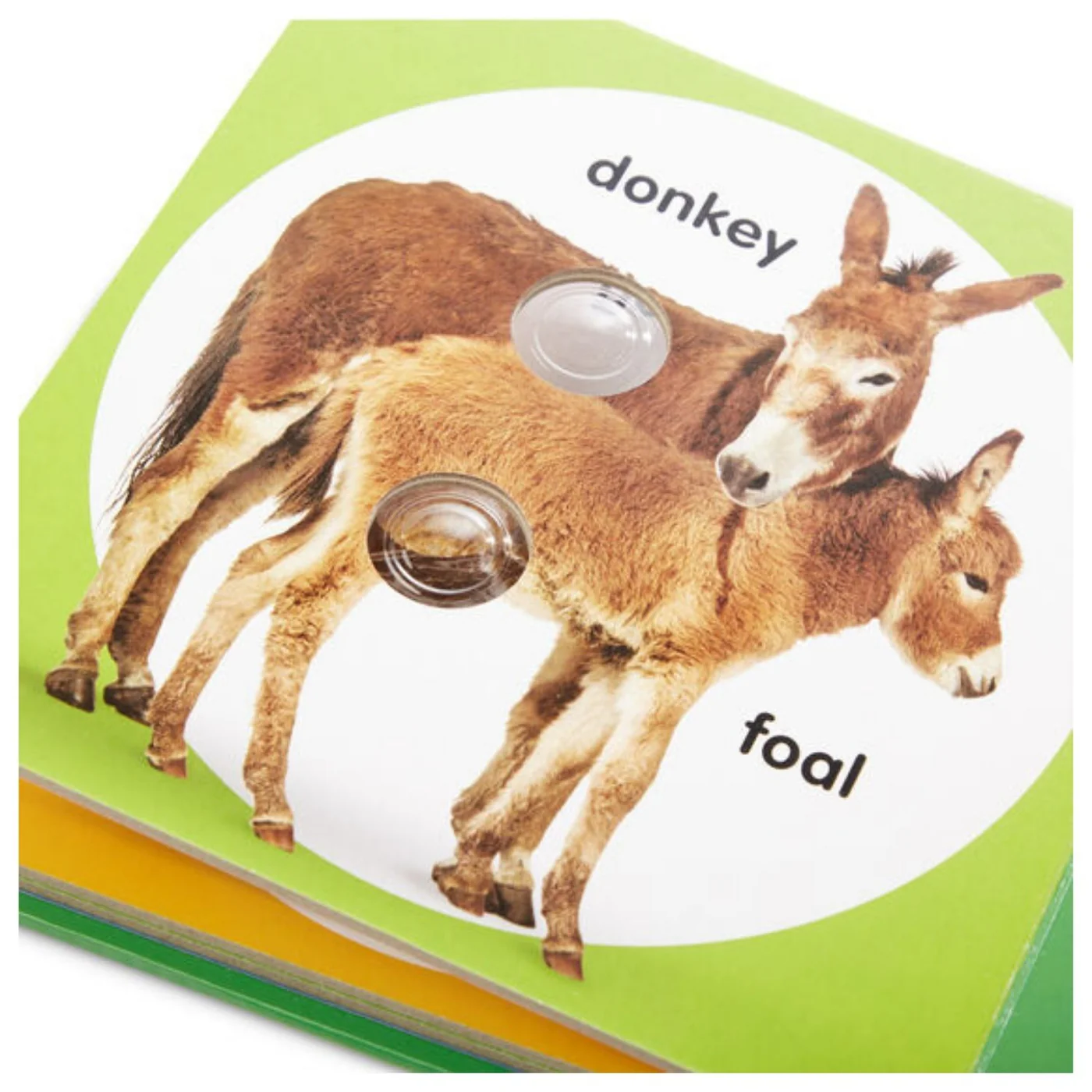 Come join the fun down on the farm! See the pictures, name the animals and their babies, and poke the irresistible buttons on every page to hear satisfying clicks and pops. This sturdy 10 page interactive board book invites kids to pop along as they explore full-color photographs of adorable farm animals and their babies (a goose and gosling, donkey and foal, goat and kid, etc.). Poke a Dot books help encourage language development, animal recognition, and fine motor skills. Patented Pop a Tronic technology lets kids one and older discover different popping sounds by poking the dots from the front or the back, with pages raised or flat!
