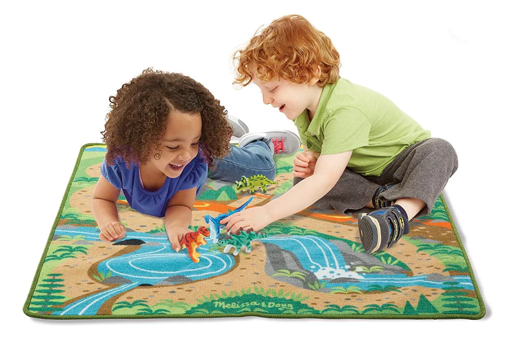 Bring to life the prehistoric giants who walked the earth millions of years ago with this sturdy, colorful dinosaur play rug! Durably made to look great for countless playtimes to come, the woven rug with a skid-proof backing comes with four flocked dinosaur figures (T-Rex, Triceratops, Stegosaurus, Apatosaurus) and features details like a bubbling volcano, waterfall, river, a cool cave, jungle, and grassland to give many options for creative play. Large format is big enough for multiple kids and lots of dinosaurs.