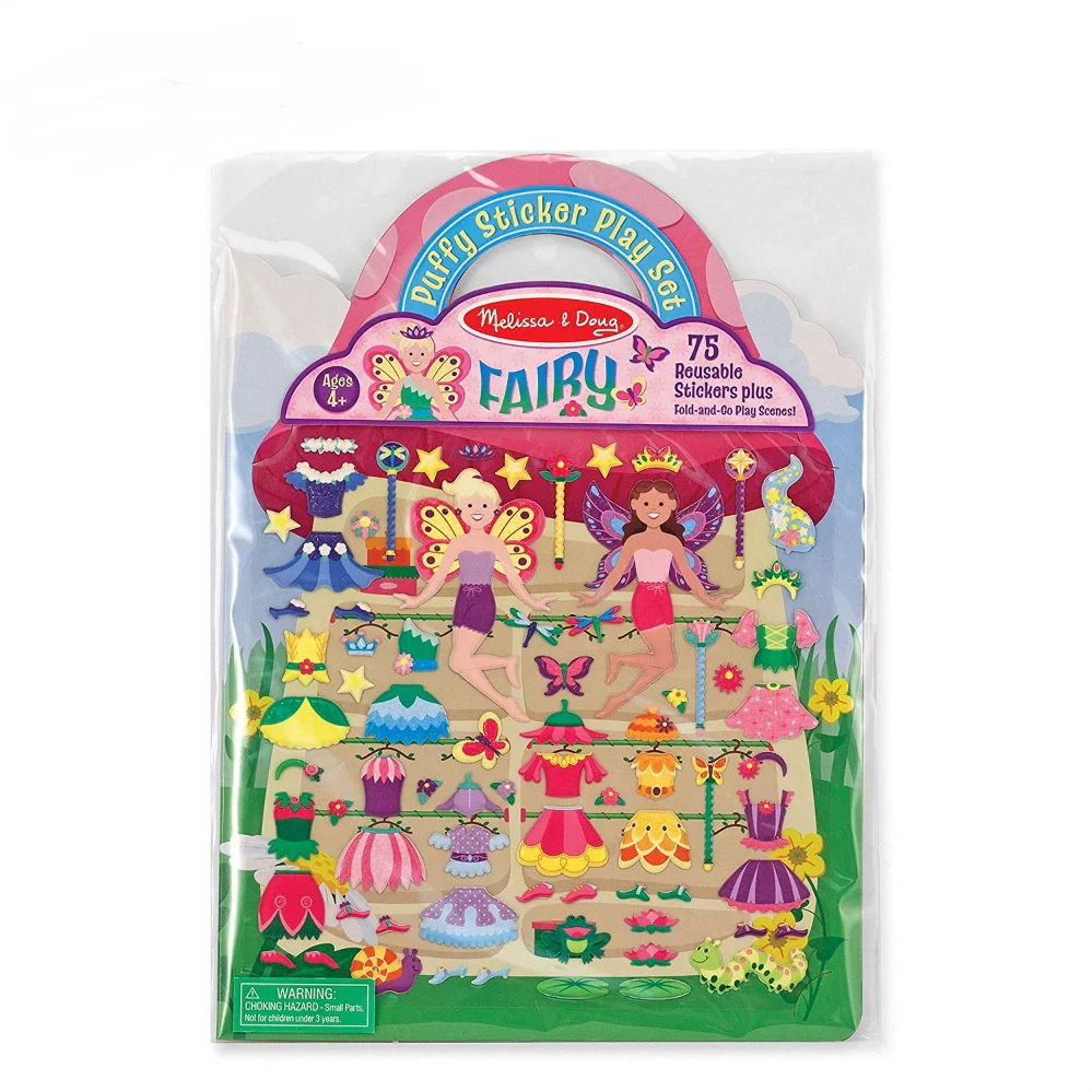 Let imagination take flight with two sensational sticker scenes! This reusable puffy sticker set includes a sturdy double-sided background panel, plus 75 glitter-filled puffy stickers. Use the stickers to fill a sundrenched meadow or twilight fairy-castle garden, adding butterflies and other fairy friends. Or dress five fairies in an array of mix-and-match tops, skirts, wands, shoes, and crowns to add some stylish fun! Easy to place, layer, and reposition, the reusable stickers make it easy to tell a story of fairy enchantment. Simply place the puffy stickers on the board, then change the picture whenever you’re ready to change the story! The built-in sticker collection–75 fairy stickers in all–offers endless opportunities for kids to express their creativity, all while improving fine motor skills and communication. A diecut handle and fold-and-go format make this kids’ sticker activity set great for travel, too!