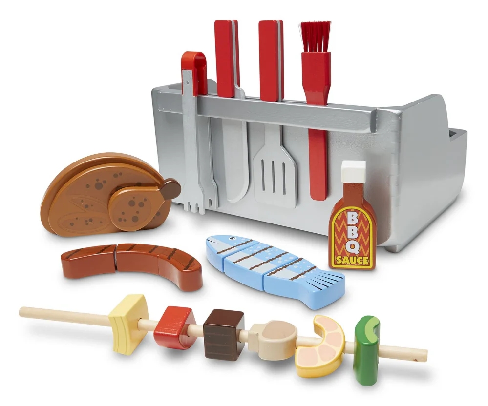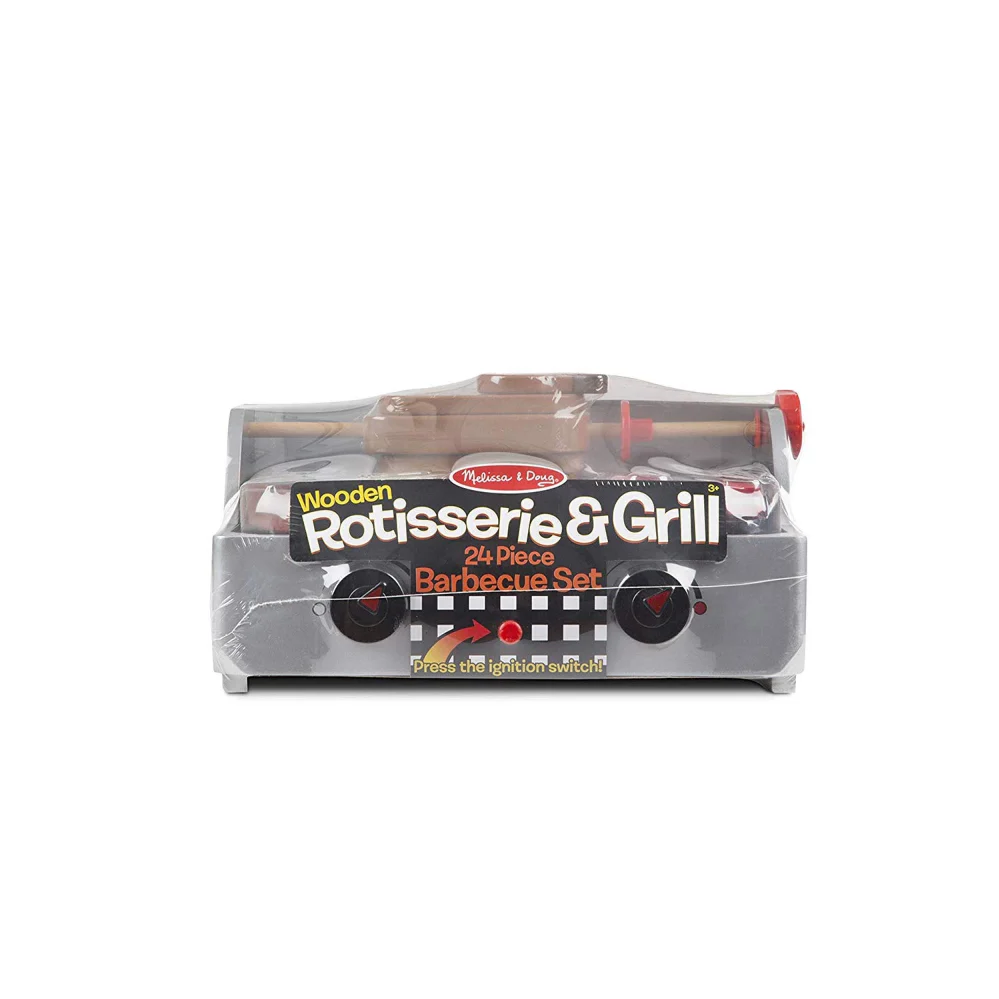 Grill it, slice it, and turn it! Cook up a fantastic feast with this deluxe wooden barbecue play set! The 24-piece set includes specialty grilling favorites like a whole rotisserie chicken that spins on a skewer, a whole fish, sausage, shrimp, and even vegetables for grilling kabobs. Use the kid-friendly wooden basting brush, spatula, tongs, and knife to prepare, flip, grab, and cut the food. This grill is easy to “fire up” with its ignition switch; adjust the temperature with the movable knobs on the barbecue, and turn the rotisserie so the food grills to perfection! The chicken, fish, and sausage pieces are held together with self-stick tabs; use the knife to slice them apart. After mealtime, use the grill as a handy storage place for all the items! The Wooden Rotisserie & Grill Barbecue Set encourages hand-eye coordination, fine motor skills, creative expression, and imaginative play.