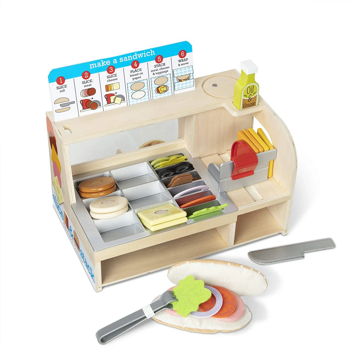 Create piled-high sandwiches, made to order with this wooden sandwich counter playset with all the Fixin’s! The sturdy wooden deli counter includes a play meat and cheese slicer for the wooden play food and felt sandwich roll and toppings to create sandwiches ordered from the menu. There is a wooden dressing bottle, play snacks, and a cup with drink insert to round out meals that customers can pay for with the included play money! An illustrated guide helps with sandwich prep and shows kids how to use the slicer. All 52 pieces store in the sandwich counter for easy cleanup. It’s a deliciously fun way to encourage counting, sorting, and fine motor skills, as well as imaginative play and storytelling.