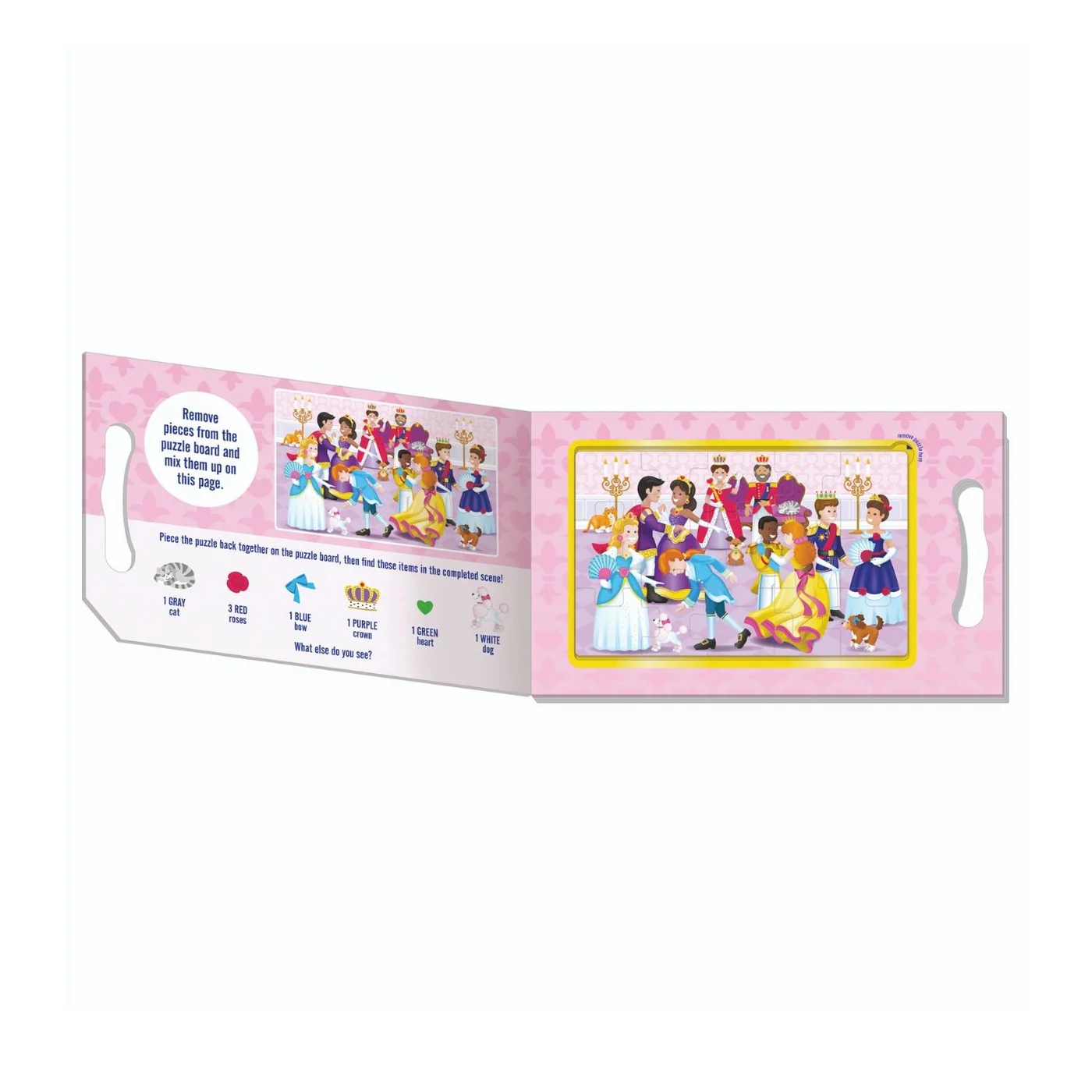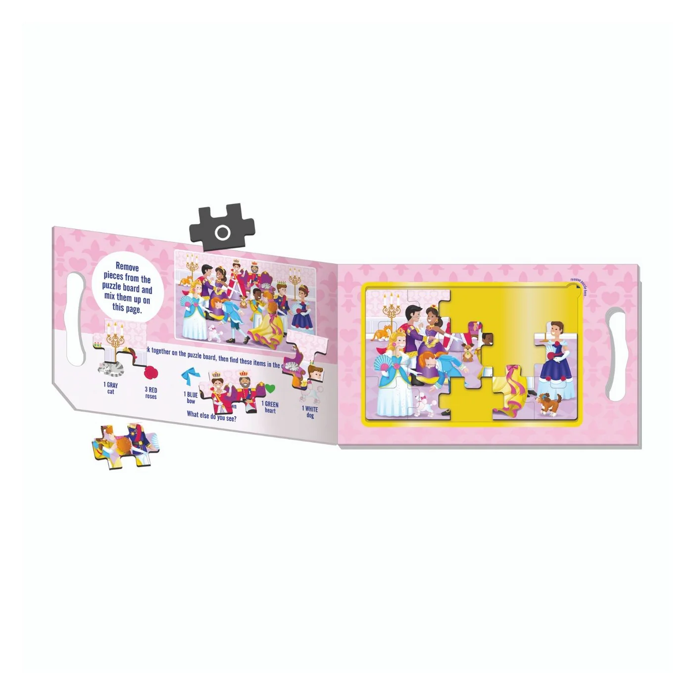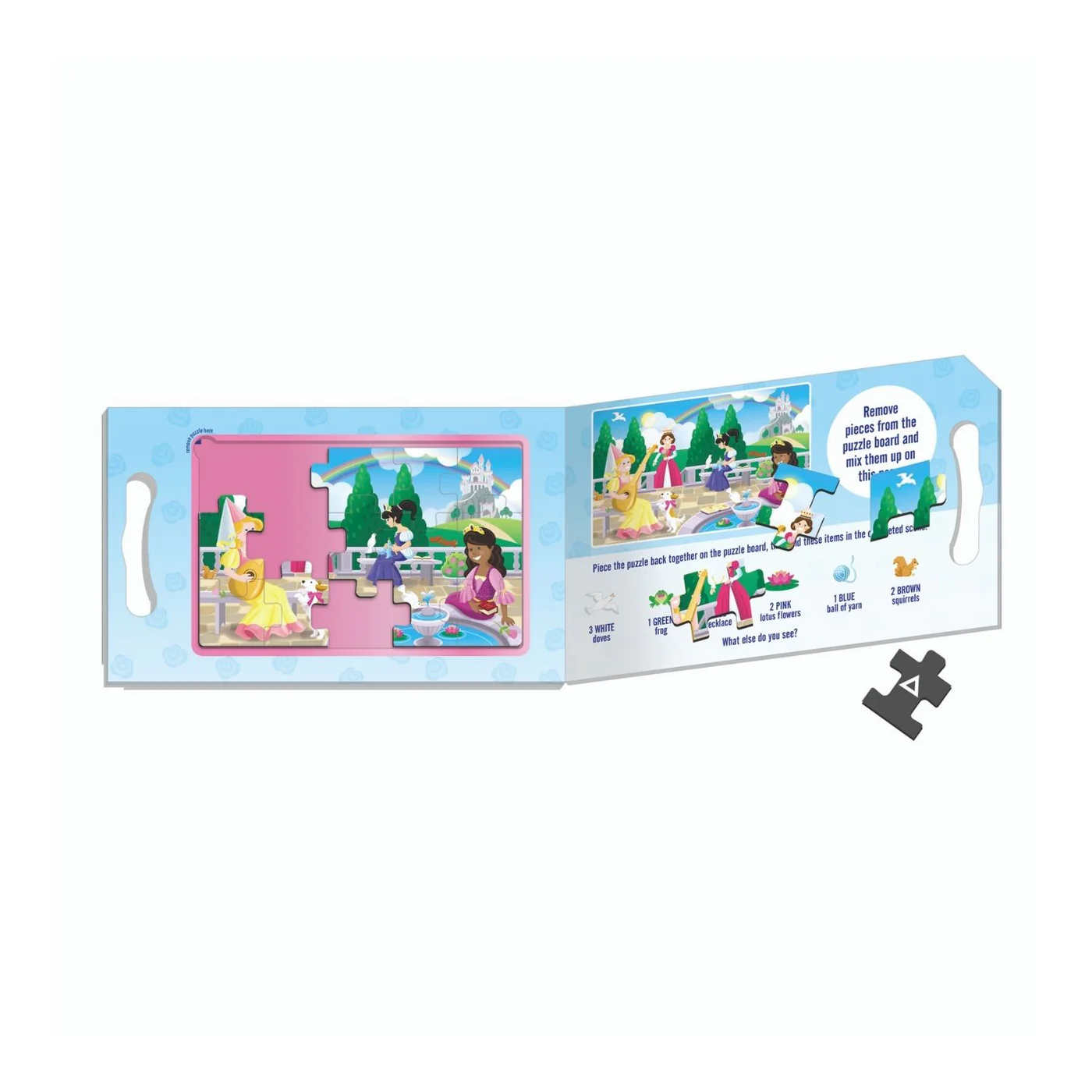 It’s never been easier to have puzzle fun anywhere, anytime! This portable playset includes two 15-piece magnetic puzzles with charming princess scenes in a compact, fold-out format and a built-in carrying handle! Pieces are shape-coded on the back for easy sorting, and cling to the inside surfaces to minimize mess, making this a terrific travel activity for kids three and older. The set includes seek-and-find activities as an extra challenge once the puzzles are completed! Puzzle play is a great way to encourage logical thinking, goal-setting, and patience.