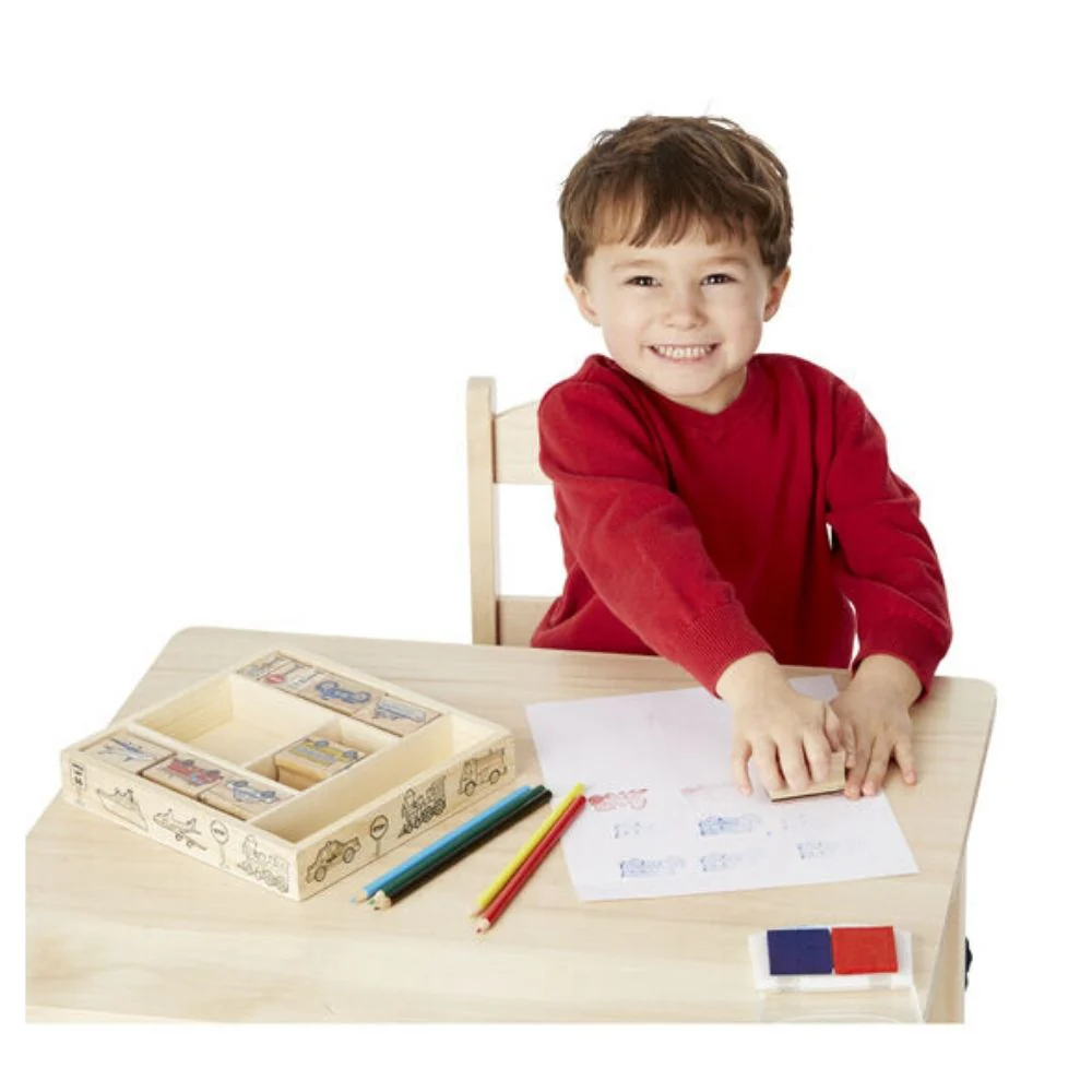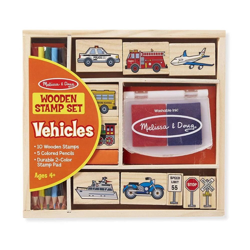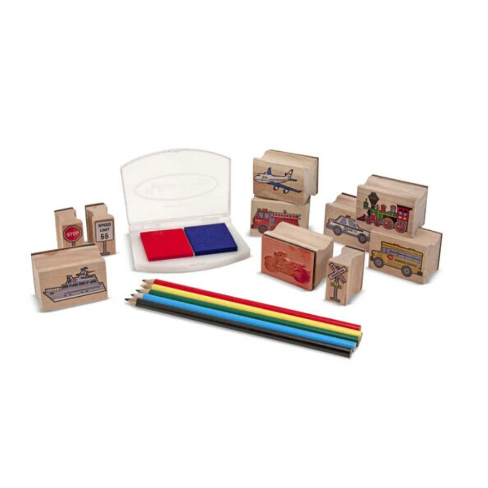 - Includes 10 stamps, 2-color stamp pad and 5 colored pencils