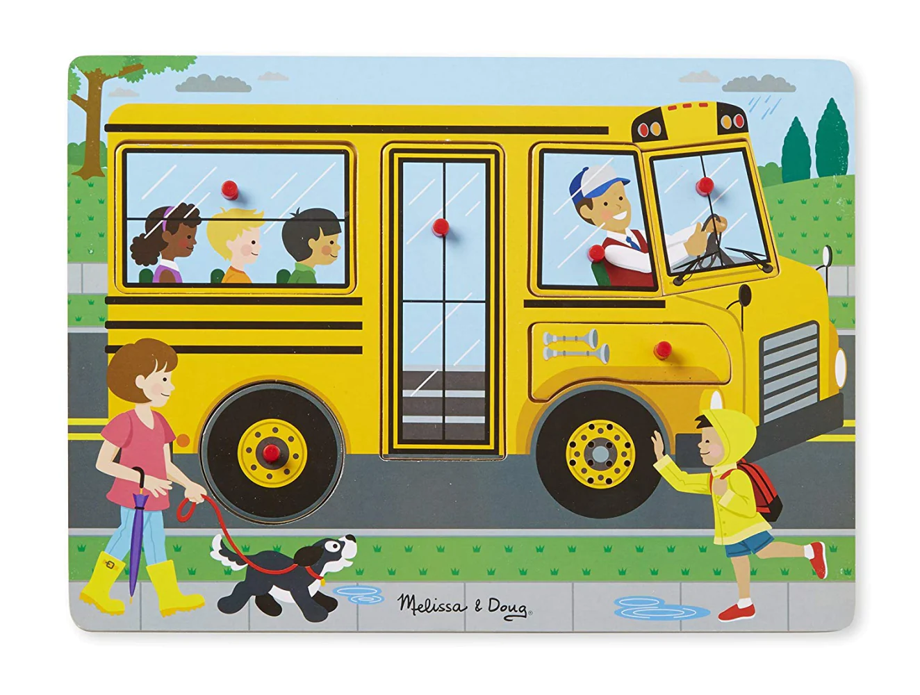 The wheels on the bus go ’round and ’round… and kids will play with this puzzle over and over! Lift the six pieces of the school bus to reveal different pictures underneath that show what’s happening, and to hear the different verses of the classic children’s song. Sing along as the wipers go, “swish, swish, swish,” the horn goes, “beep, beep, beep,” and more! The lyrics are on the back of the sturdy wooden resting board to help kids learn the words. Shaped wooden pieces with durable plastic pegs are easy for small hands to grasp, making this a perfect preschool puzzle (ages 2+) that helps with fine motor skill development, as well as auditory processing.