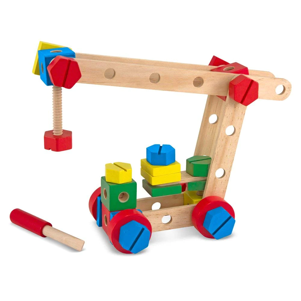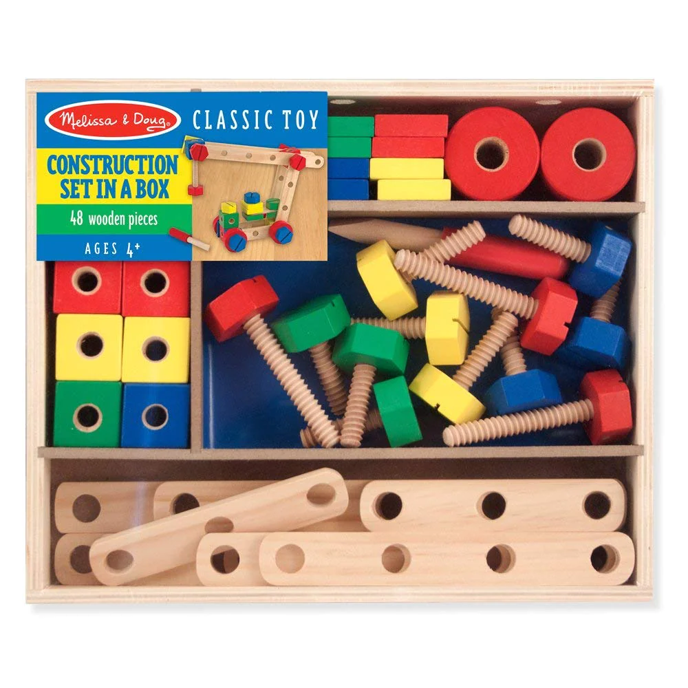 With 48 wooden pieces (including nuts, bolts, drilled bars to connect, and a child-size screwdriver), this classic building set gives kids all they need to tinker and build! Printed right on the sturdy storage box are building plans for a crane, motorcycle, airplane, and race car to get the fun started. With some imagination and a few creative twists and turns, kids can make hundreds more amazing structures, too! Any time kids play with this durable set, they’ll be building fine motor skills, problem-solving skills, and hand-eye coordination. Included extension activities guide parents to educational activities that also build early math skills.