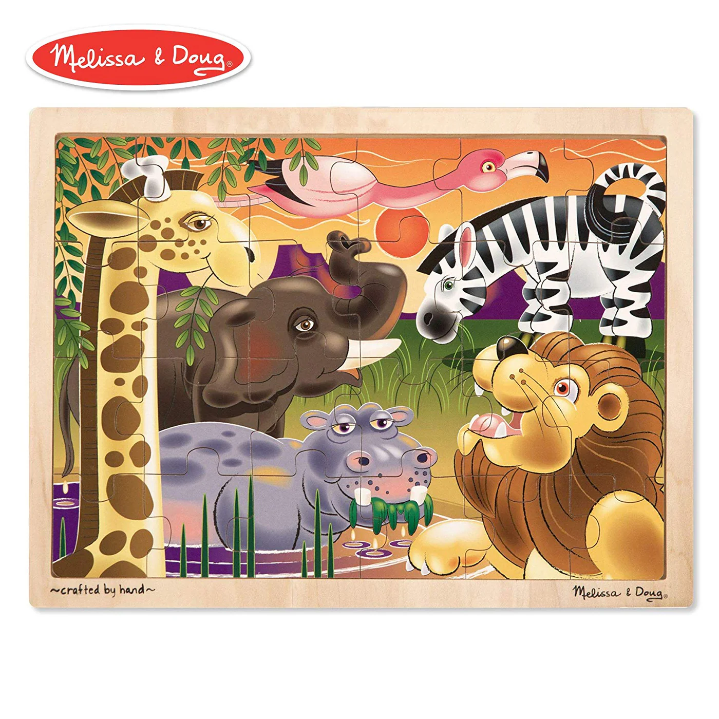 The sun may be setting on the Savannah, but this 24-piece wooden jigsaw from Melissa & Doug provides puzzle fun at any time of day. With a hippo in the watering hole and a flamingo in flight, assembling this jigsaw reveals part of African life with every piece. This educational kids’ puzzle comes packaged in a sturdy wooden tray for play and easy storage.