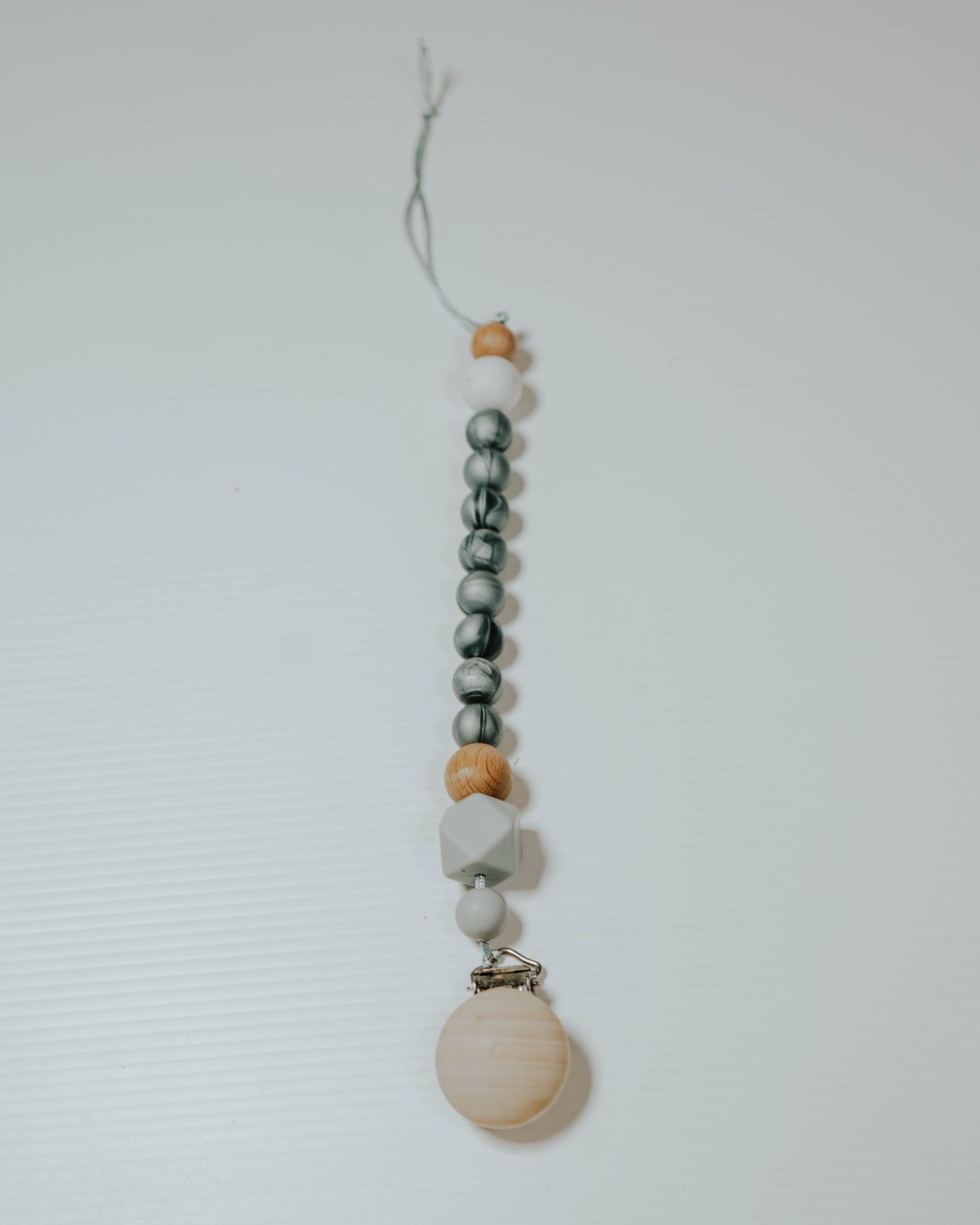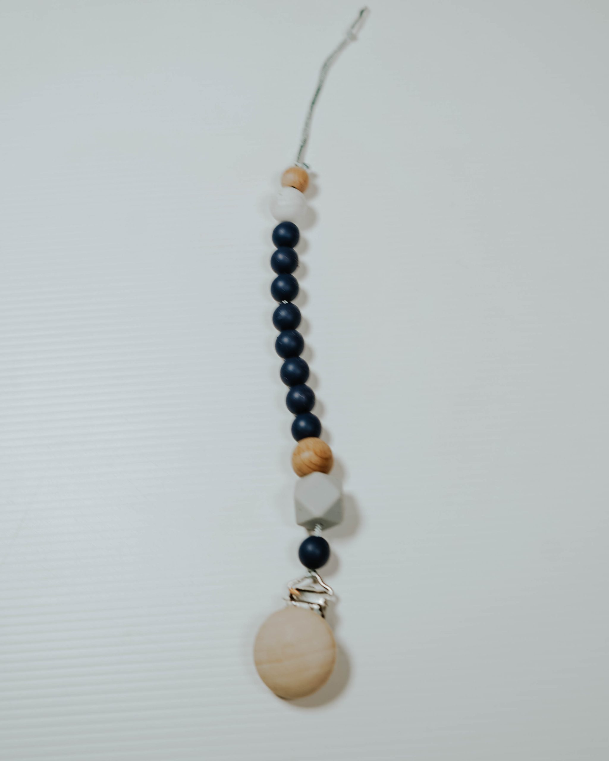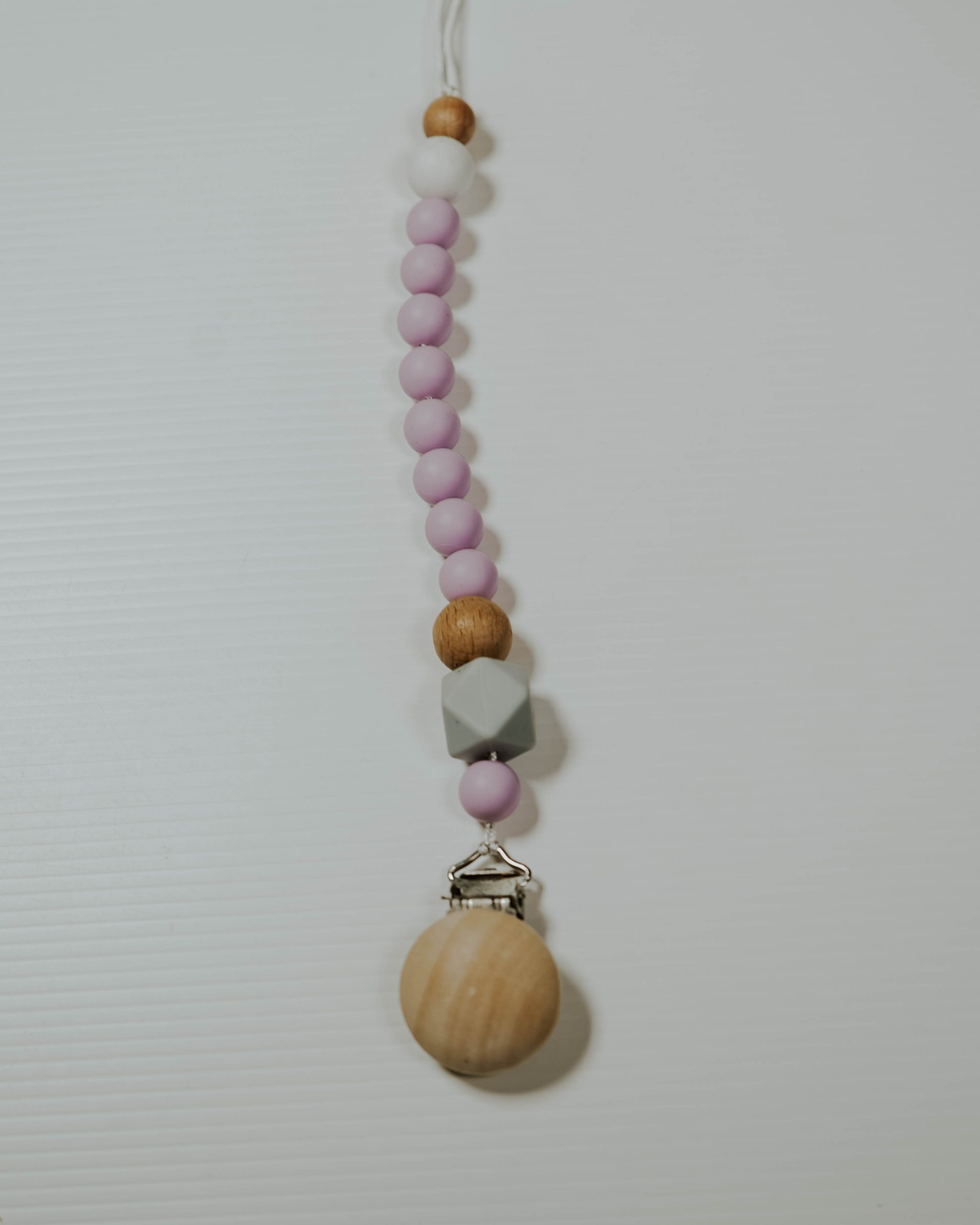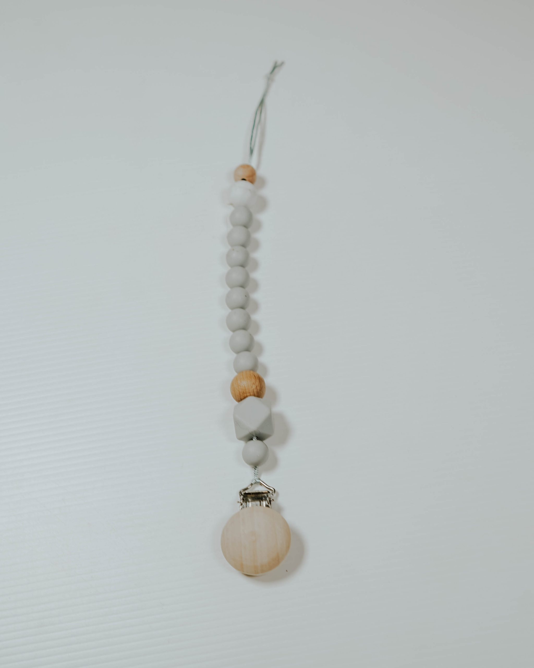 Approximately 20cm in length, the dummy clip has a dual function through also being a teether if necessary. The large soft silicone beads are perfect for teething little ones to chew on when they feel it necessary. The clip is covered in a beautiful light wood with smooth finish and dome design, for a elegant modern look.