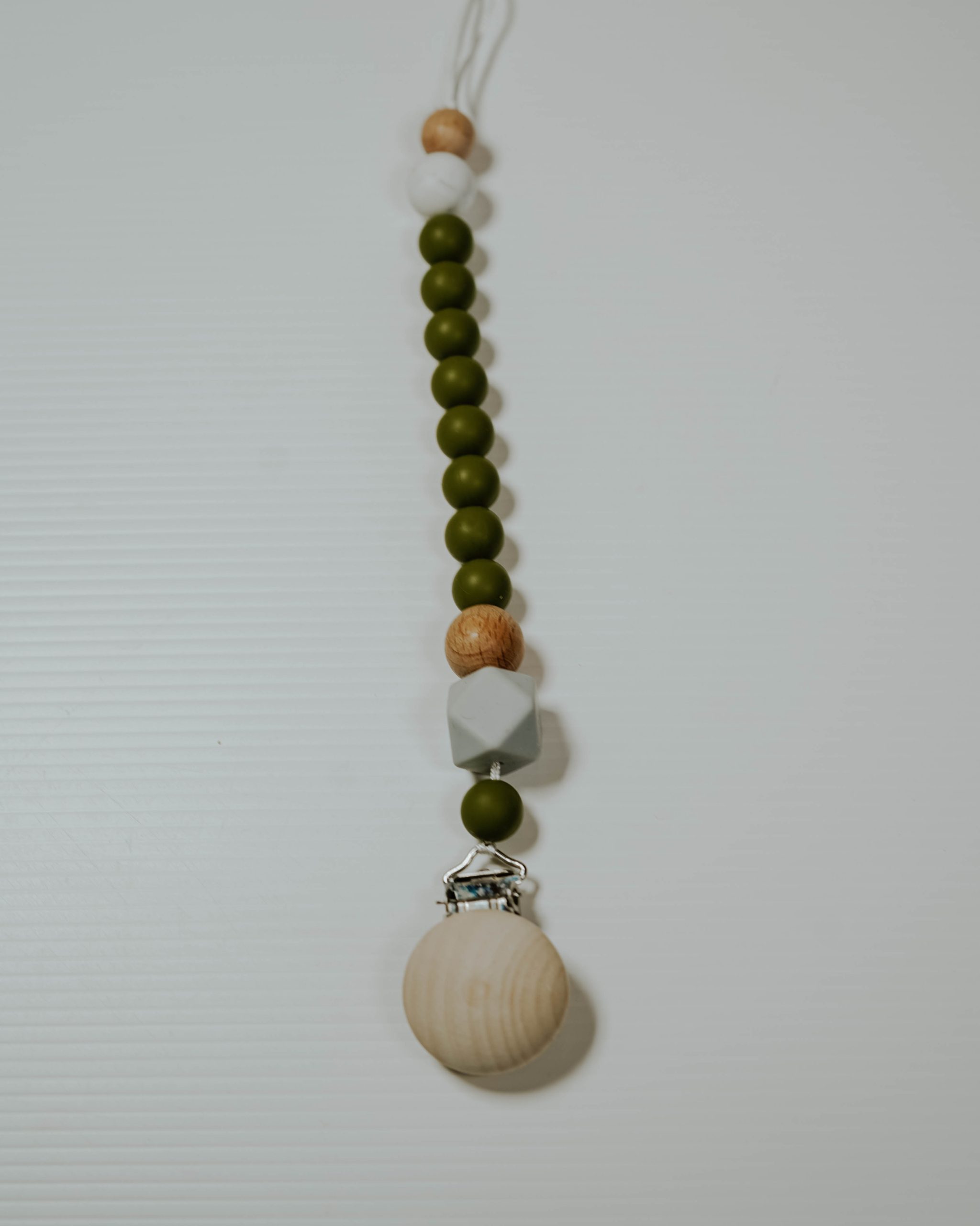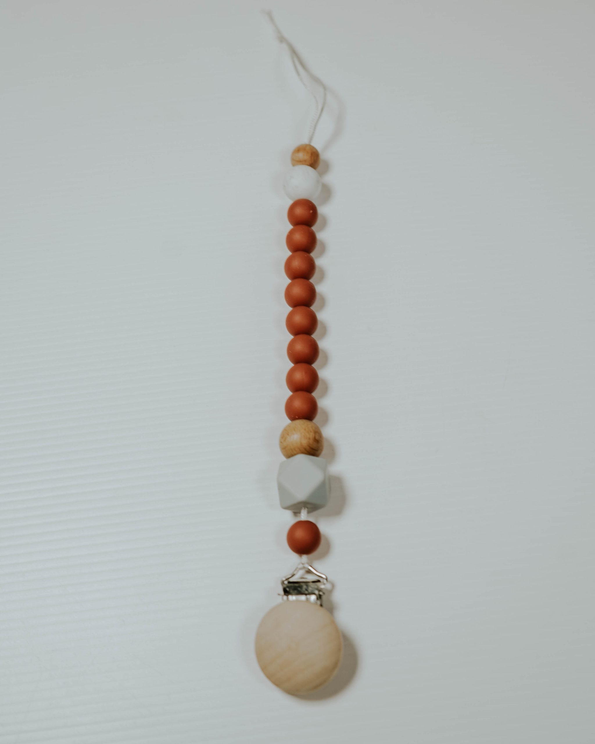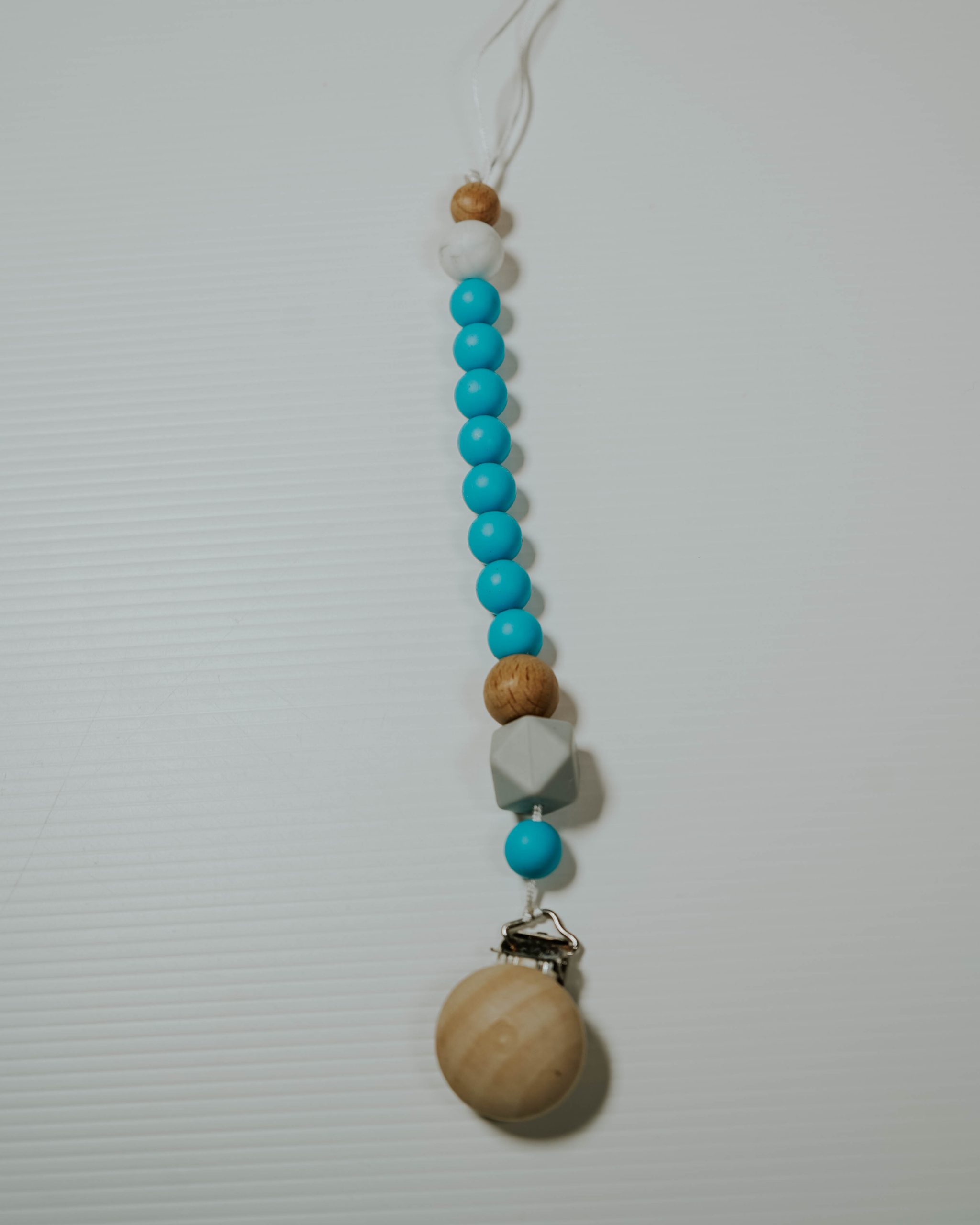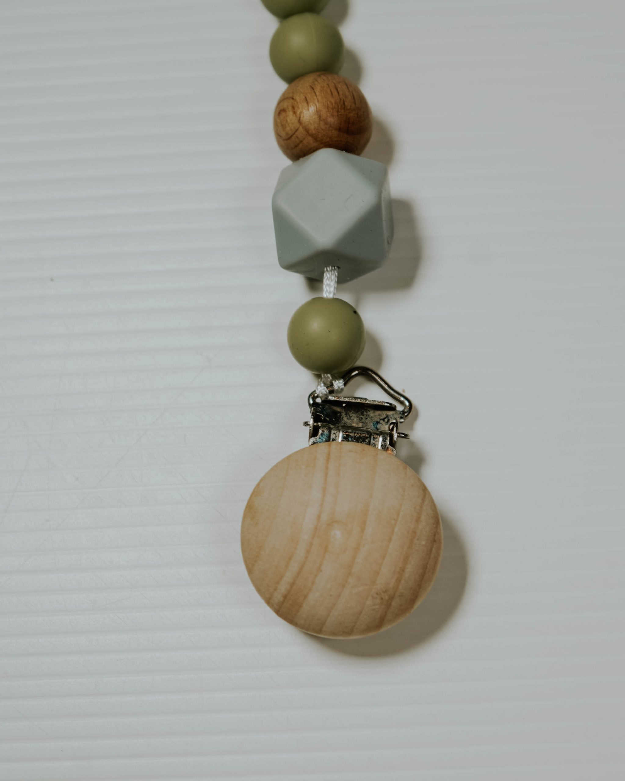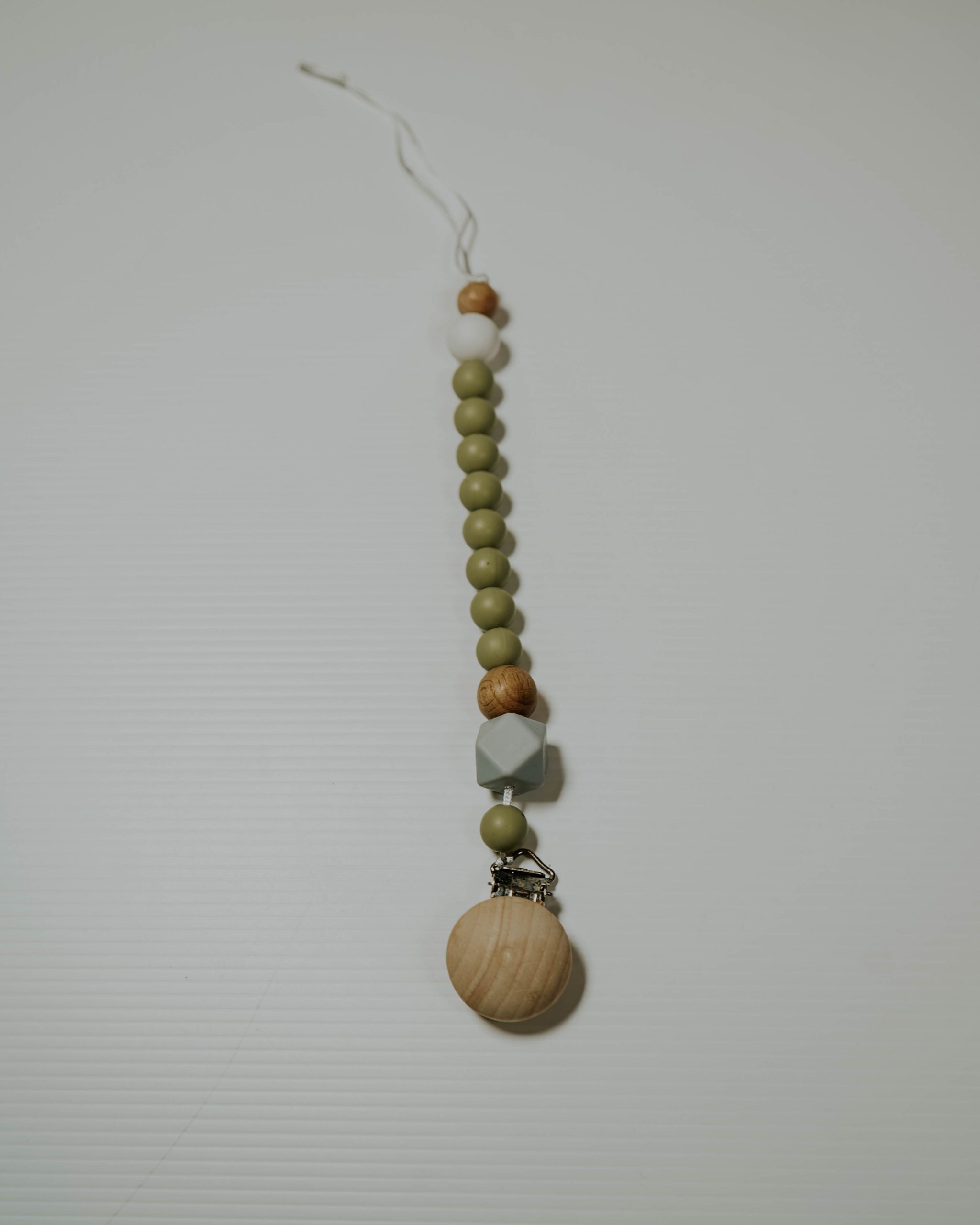 Approximately 20cm in length, the dummy clip has a dual function through also being a teether if necessary. The large soft silicone beads are perfect for teething little ones to chew on when they feel it necessary. The clip is covered in a beautiful light wood with smooth finish and dome design, for a elegant modern look.