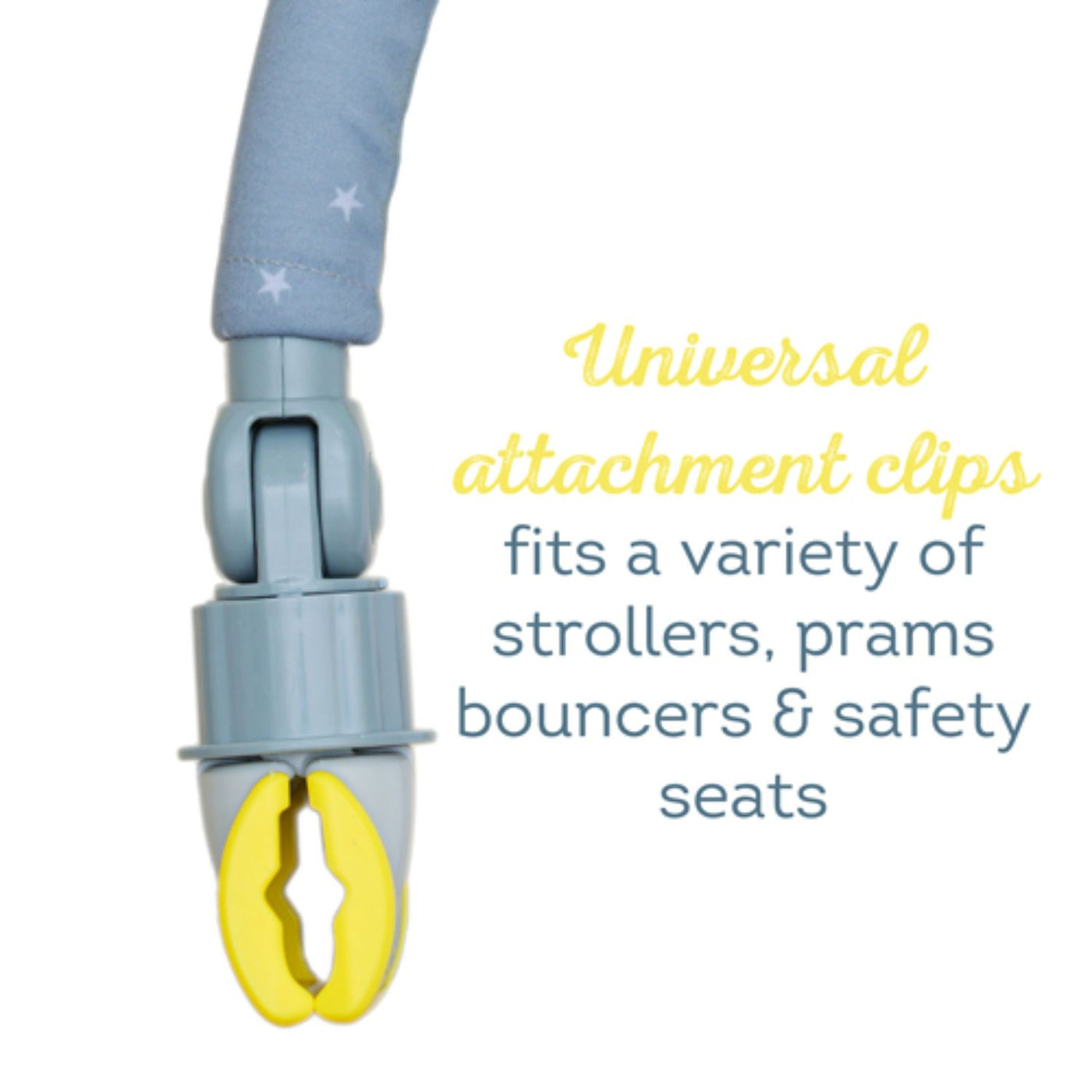 - Easily attaches to most prams, strollers, infant car seats or bouncers with large adjustable plastic clips.