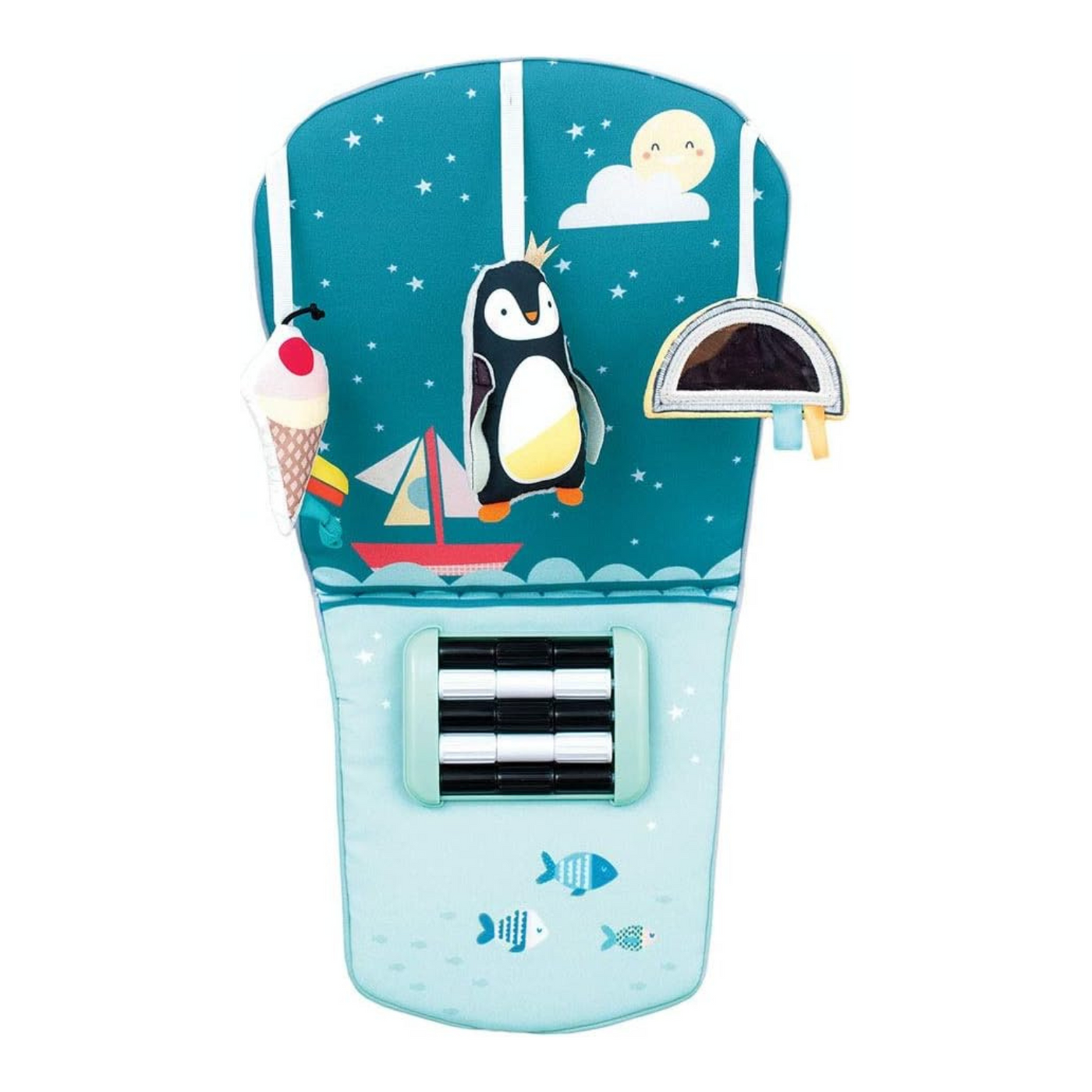 - Includes three loveable hanging toys – a rattling penguin, rainbow baby-safe mirror and a crinkling ice-cream cone.