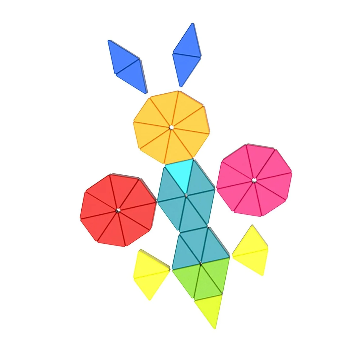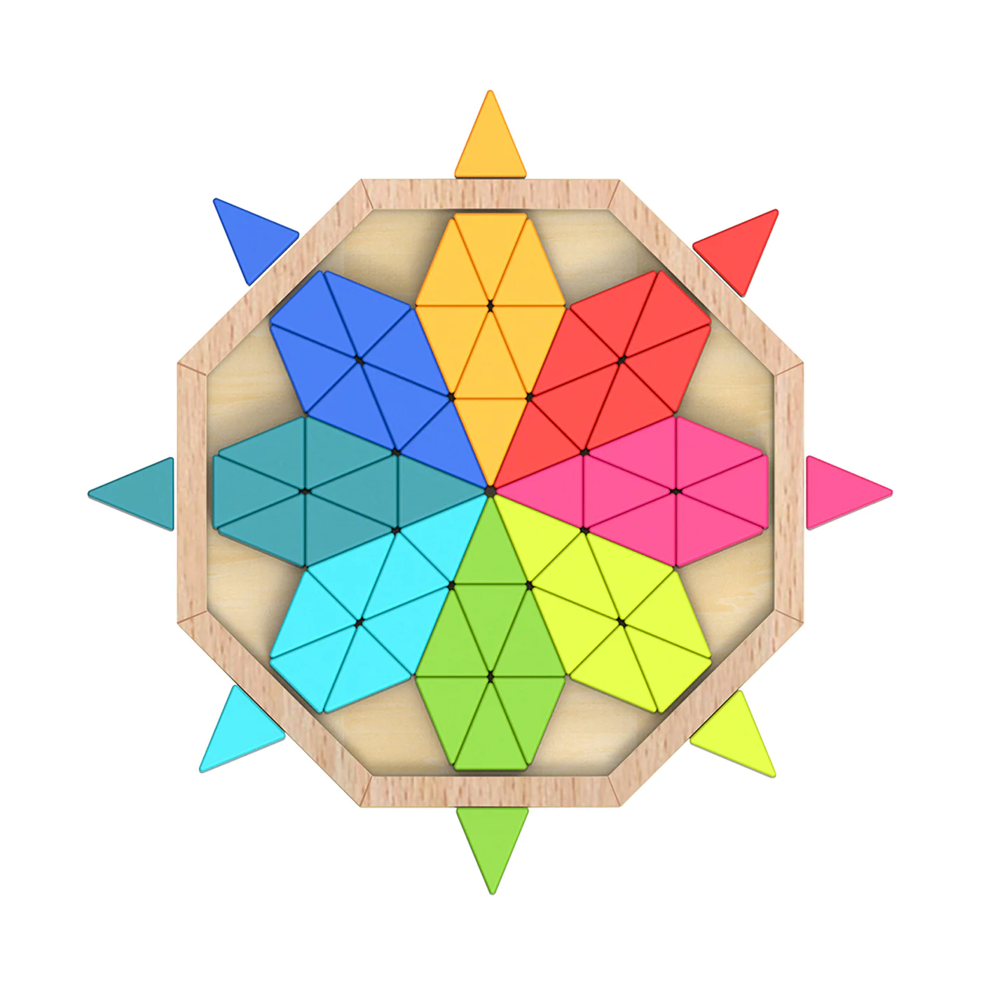 The triangular pieces work like mosaics whereby you can explore geometric forms. There are endless shapes that can be made and hand-eye coordination, fine motor skills as well as problem-solving skills are stimulated while playing.