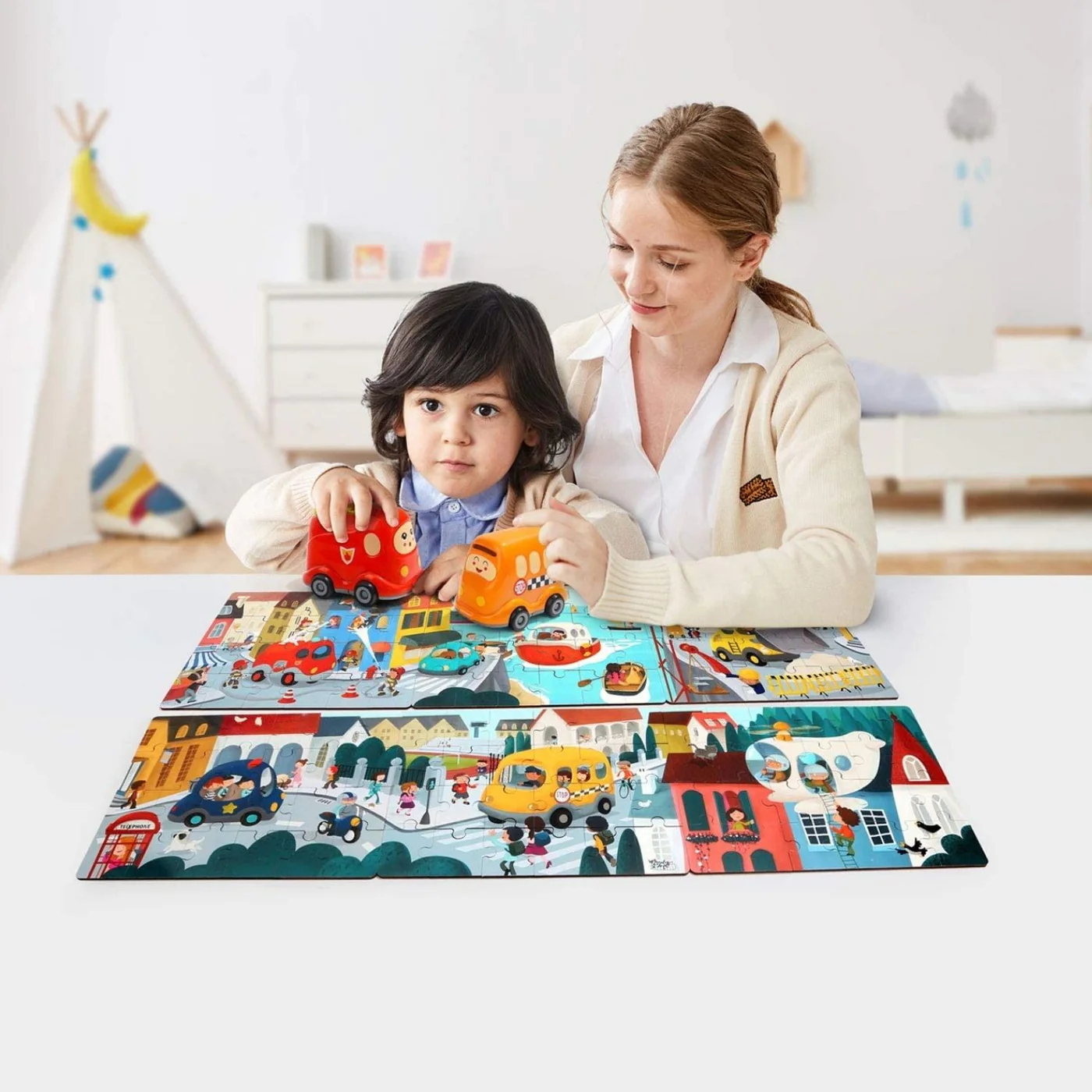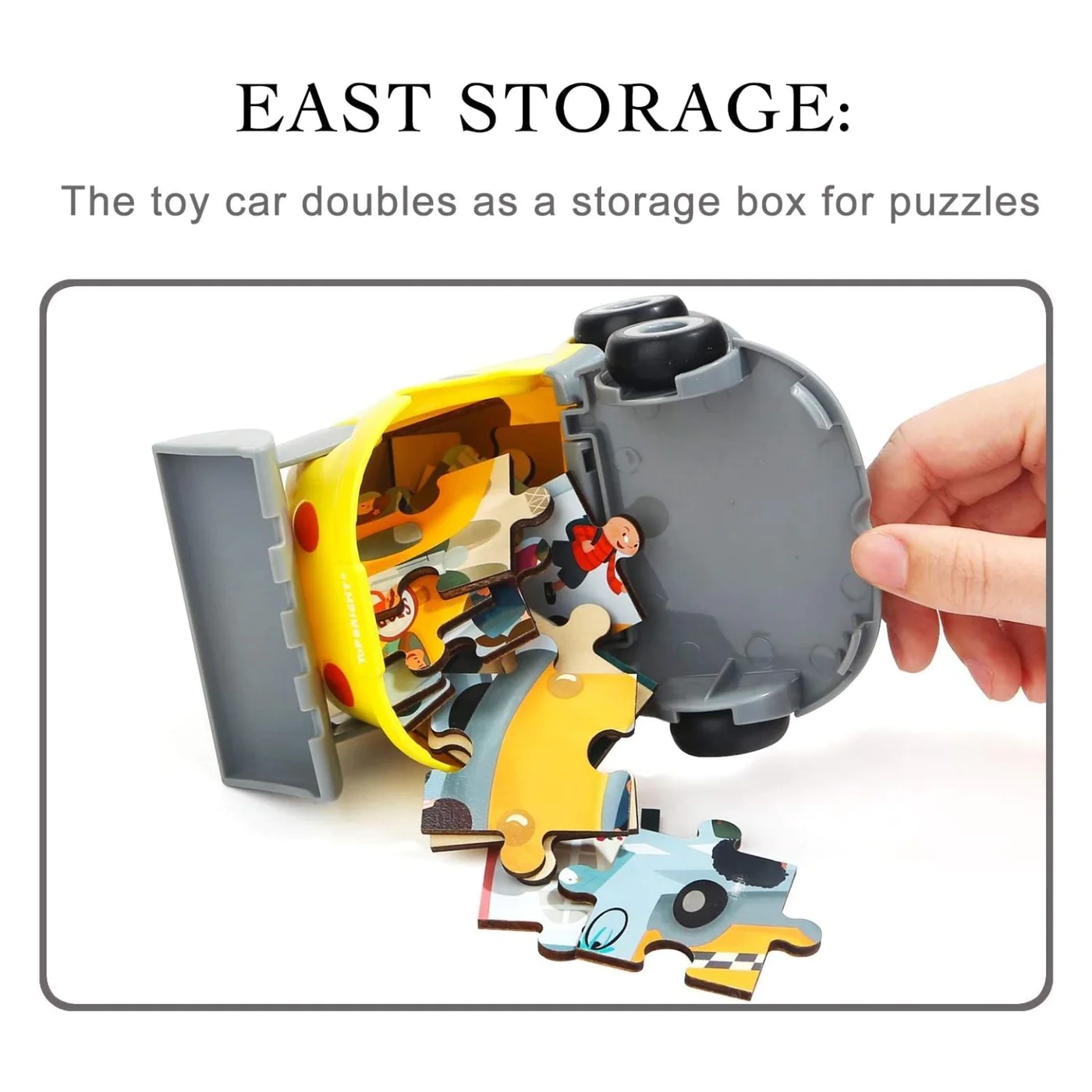 Our toddler wooden puzzle is a high-quality and educational toy for your 3-year-old. This colorful puzzle comes inside a car toy, and each puzzle has a number on the bottom of each piece to guide toddlers in learning puzzle knowledge. They are made of premium wood, safe for your kids.