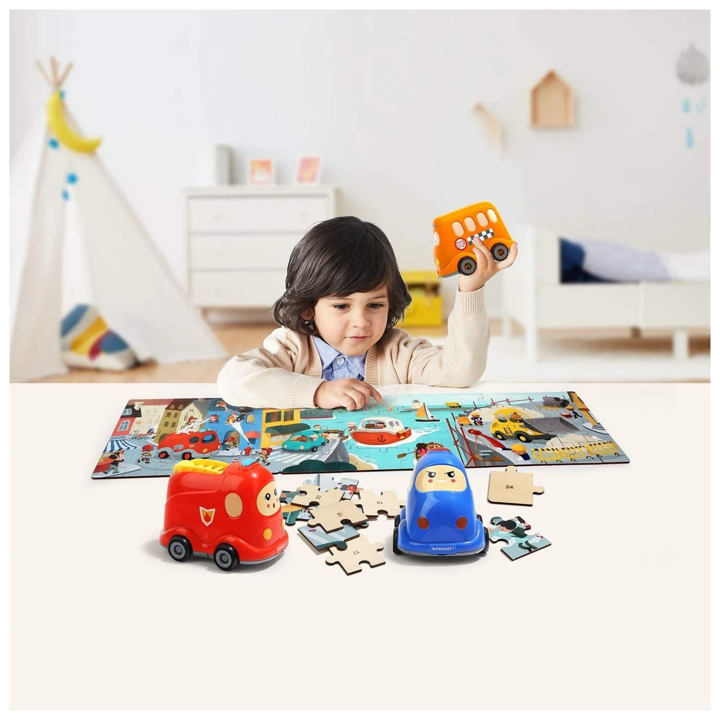 Puzzles for toddlers 3 years come with 24 pieces of puzzles and one car toy. There are numbers behind each piece of the wooden floor puzzles to guide toddlers and learn logical thinking. The puzzle is a great way for toddlers to have fun while developing physical, cognitive, and emotional skills.